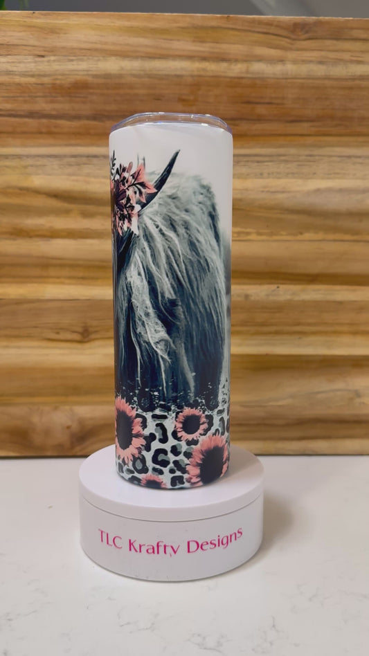 Highland Cow Tumbler with Floral Crown & Sunflowers – Custom Animal Print Drinkware