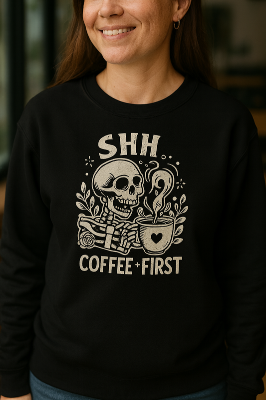 Shh… Coffee First Hoodie – Funny Skeleton Coffee Lover Pullover