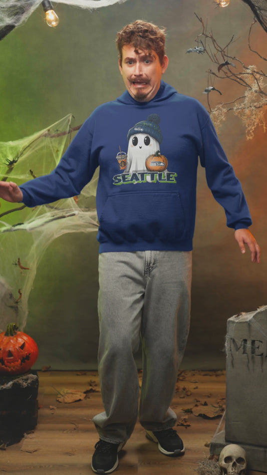 Seattle Ghost Hoodie – Cozy Fall Halloween Sweatshirt with Pumpkin & Coffee Design