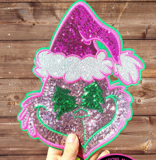 XL Grinchy Chenille Sequin Patch – Festive Christmas Iron-On / Sew-On Appliqué CK