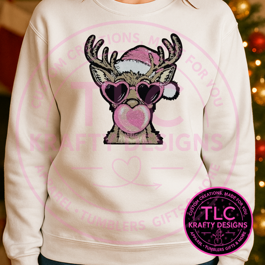 XL Pink Reindeer Chenille Patch – Holiday Deer with Heart Sunglasses & Bubblegum
