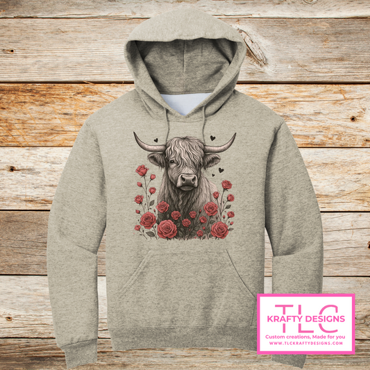 Highland Cow Floral Hoodie – Cute Cow and Rose Sweatshirt | Cozy Country Cowgirl Pullover