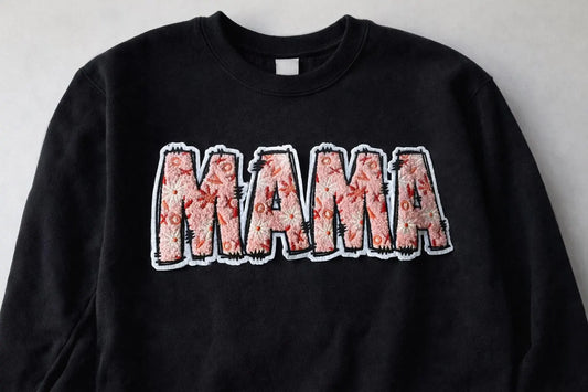 XL MAMA Black Fuzzy Chenille Patch Apparel – Mom Life T-Shirt or Sweatshirt
