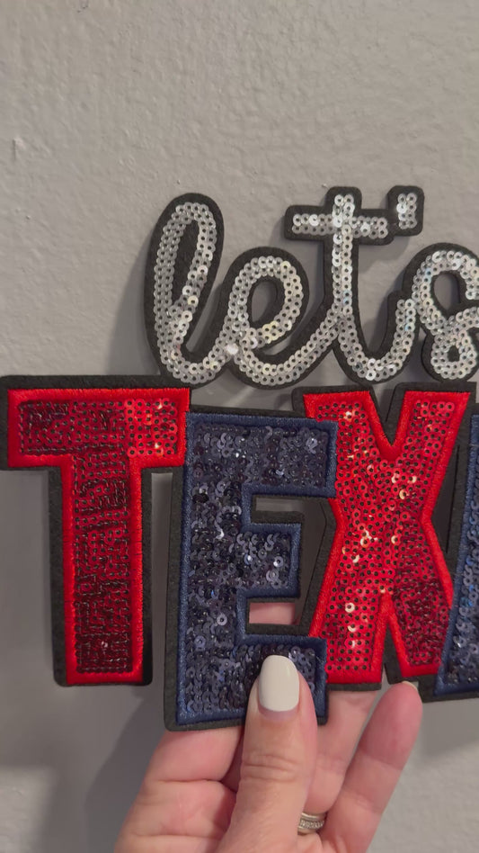 Let’s Go Texans XL Iron On Patch | Football Spirit Chenille Patch | Red White Blue Sports Patch | Game Day Jacket Sweatshirt Patch