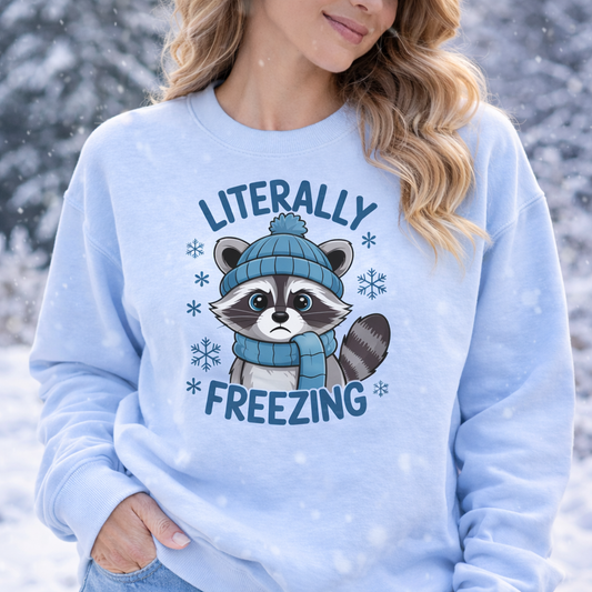 Literally Freezing Raccoon T-Shirt or Sweatshirt – Funny Winter Graphic Apparel