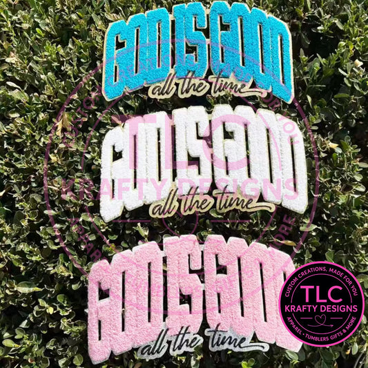XL God is Good All the Time Chenille Patch – White Chenille with Gold Glitter Outline Iron-On