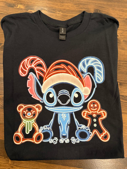 LAST CHANCE Neon Outline Santa Stitch T-Shirt - Festive Christmas Short Sleeve Tee CK