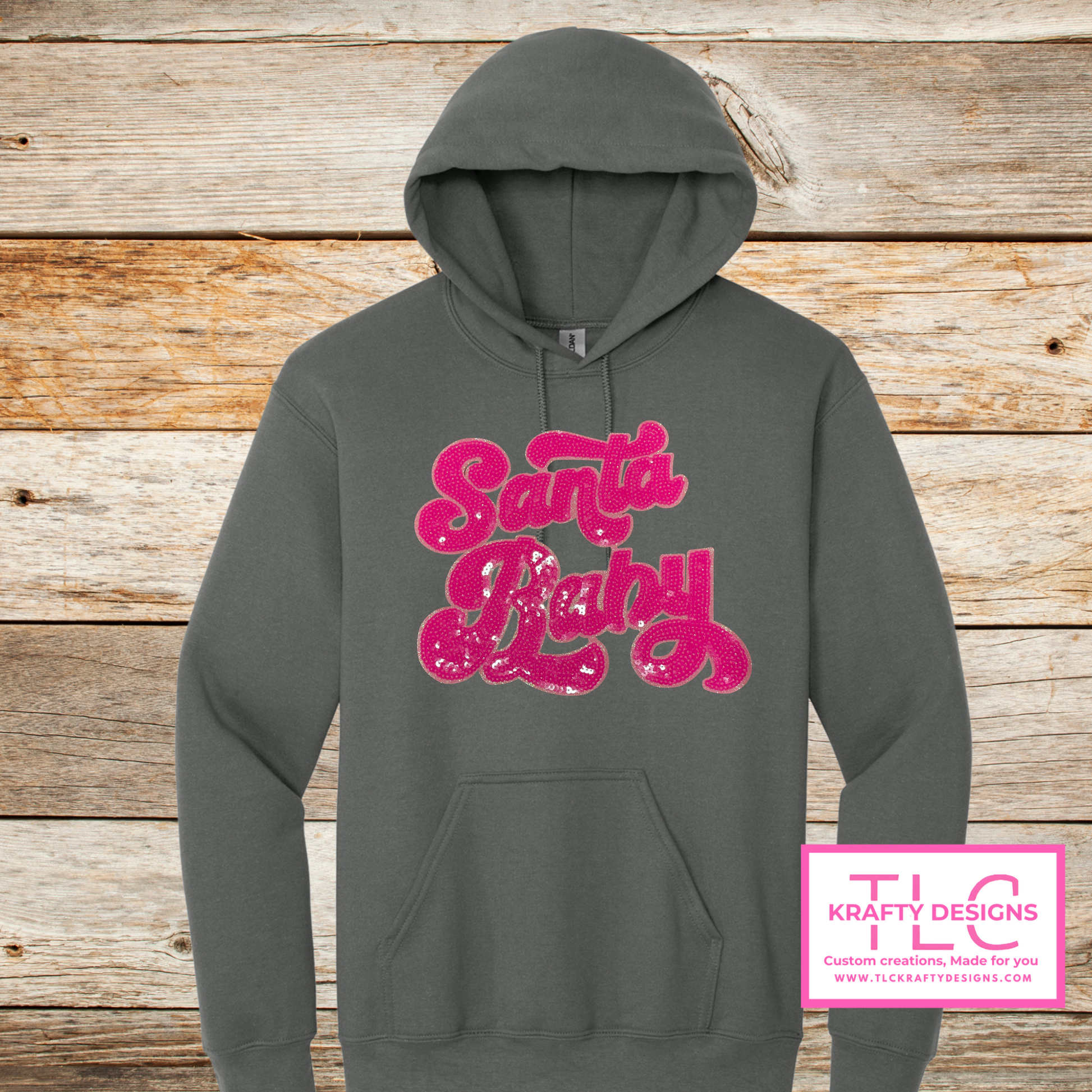 Bring the glam this holiday season with our bold and sassy Santa Baby sweatshirt! This design features a hot pink sequin patch in a fun, retro scriptβ€”perfect for those who love a little sparkle in their seasonal style.