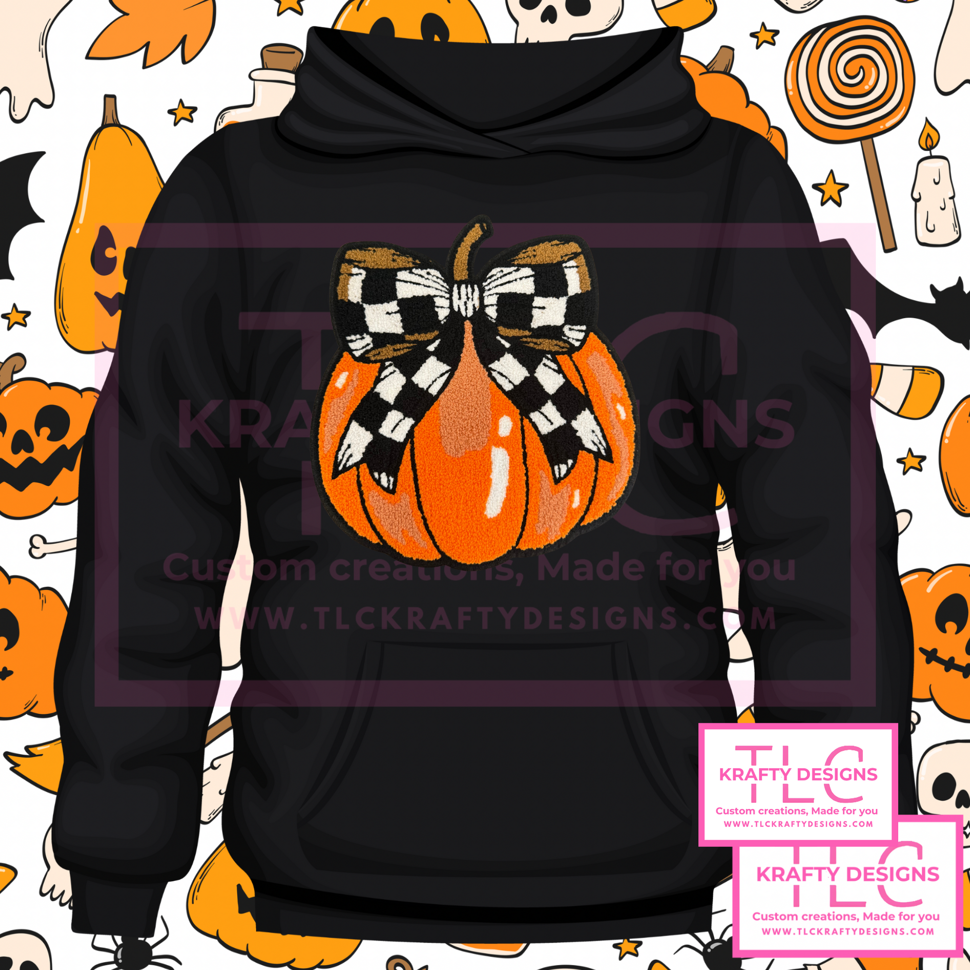 π Pumpkin with Checkered Bow Patch β Chenille Iron-On Fall Accent Sweatshirt (Approx. 10β)