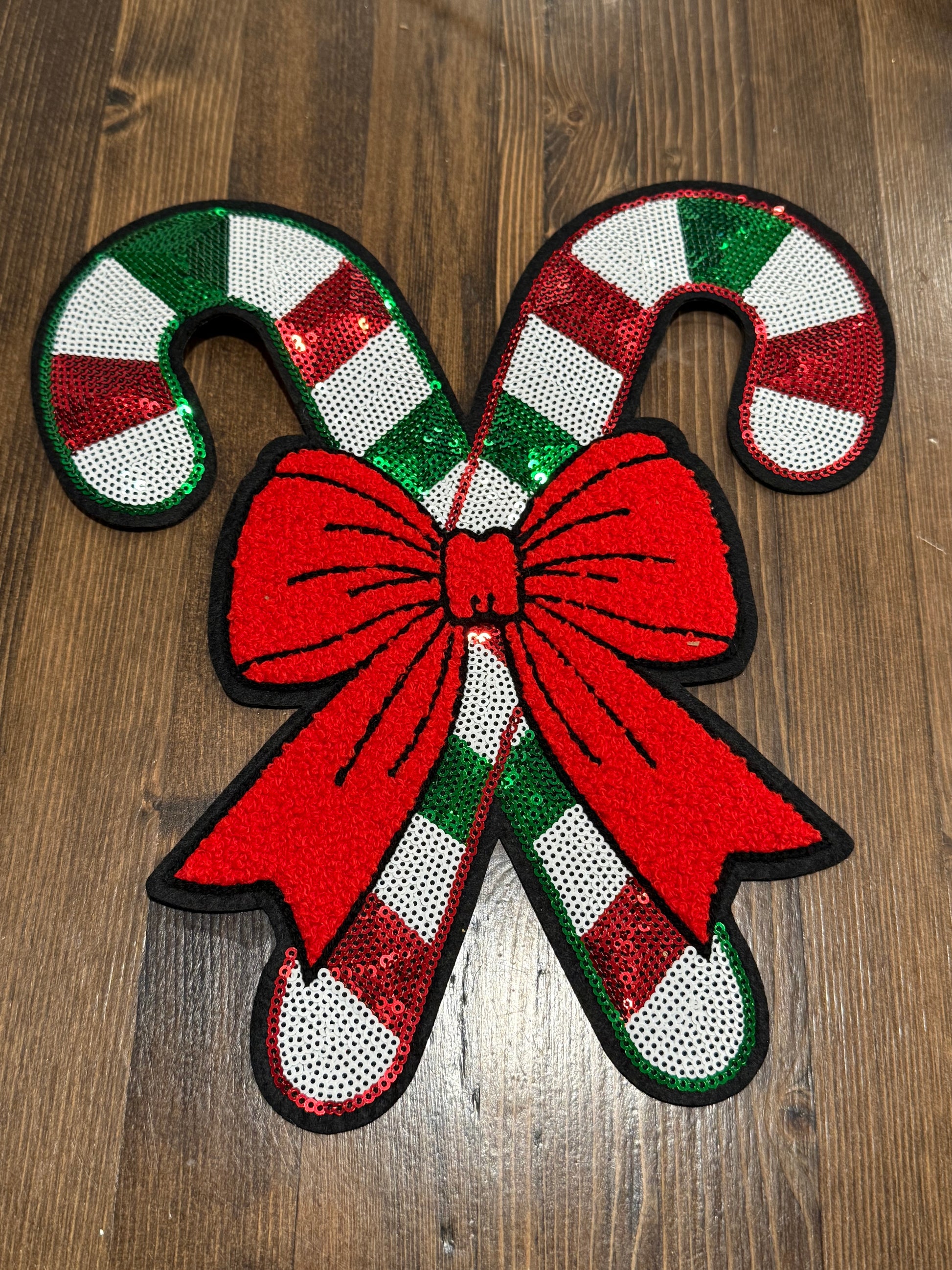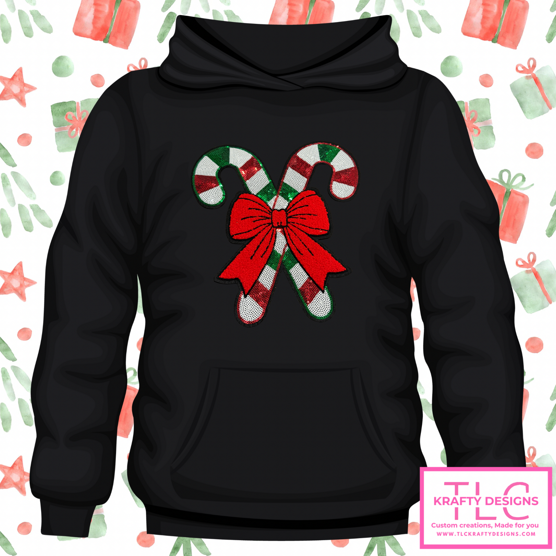 Celebrate the season in sweet style with this cozy sweatshirt featuring a festive candy cane patch! With red, green, and white sequins and a bold red chenille bow, this holiday-ready hoodie or crewneck brings just the right amount of sparkle.