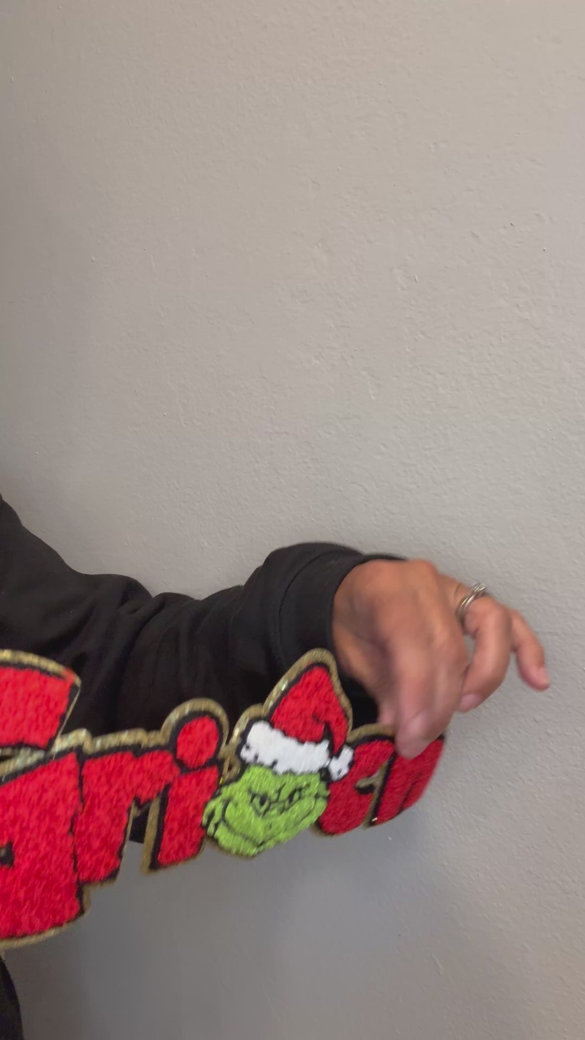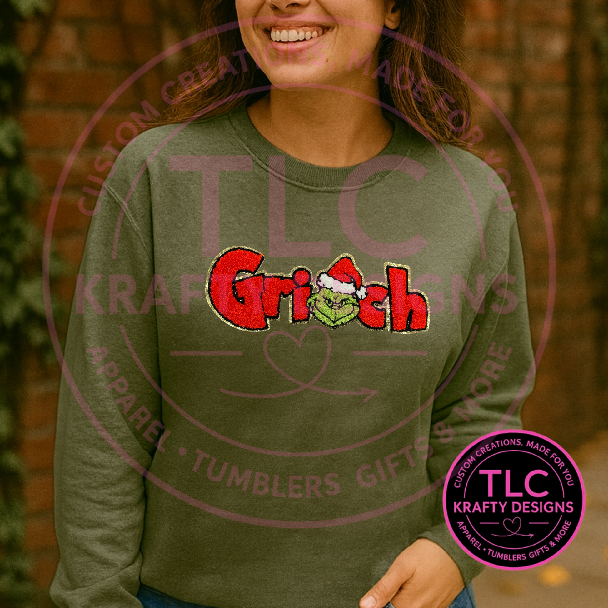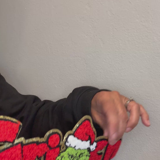 Add a touch of holiday mischief with this bold red chenille “Grinch” patch, complete with a Santa hat and gold sequin trim. Perfect for sweatshirts, hoodies, totes, and more!
