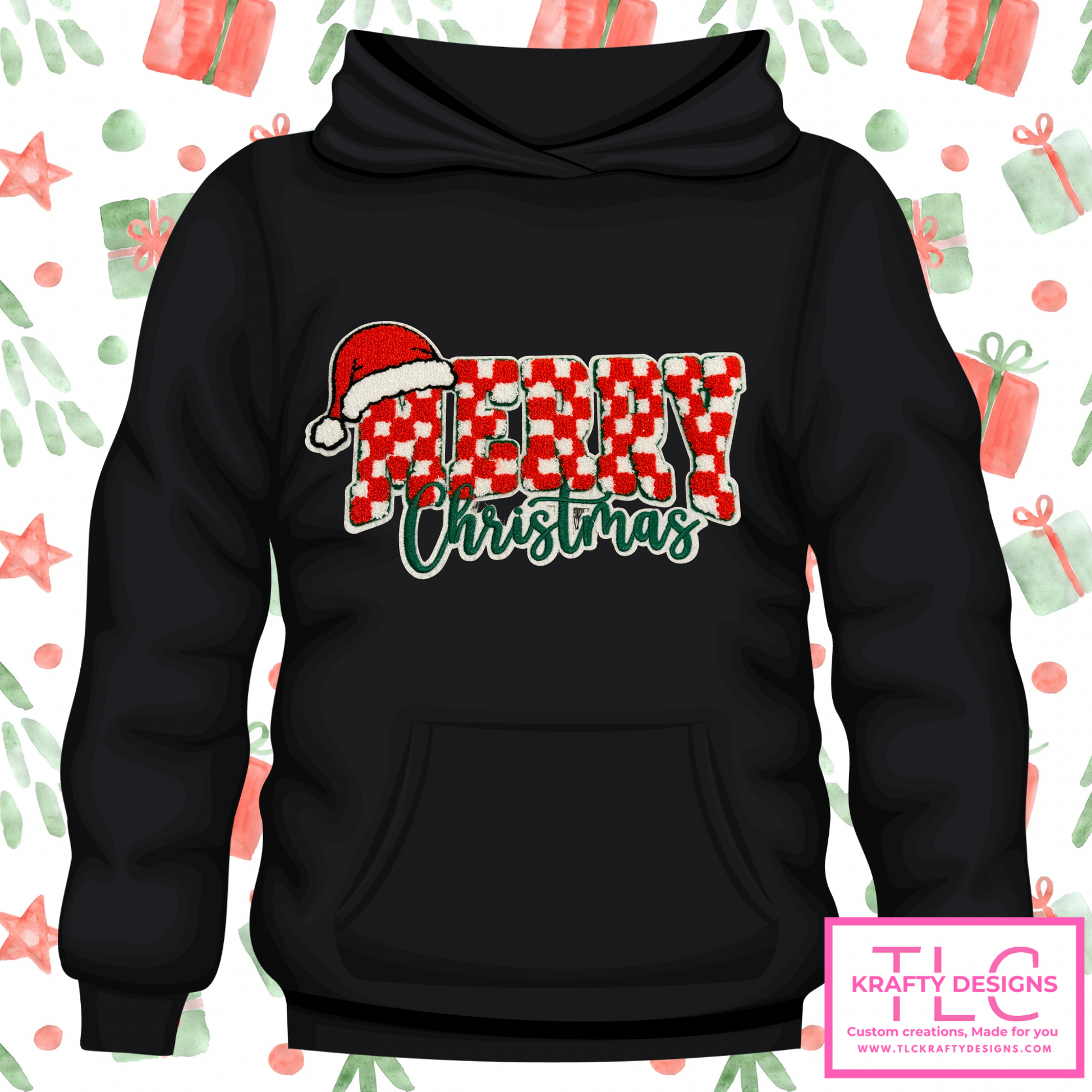 Cozy up in style with this festive holiday hoodie! Featuring a bold red-and-white checkered βMERRYβ chenille patch, a cute Santa hat accent, and βChristmasβ embroidered script, this sweatshirt is a must-have for holiday lovers.