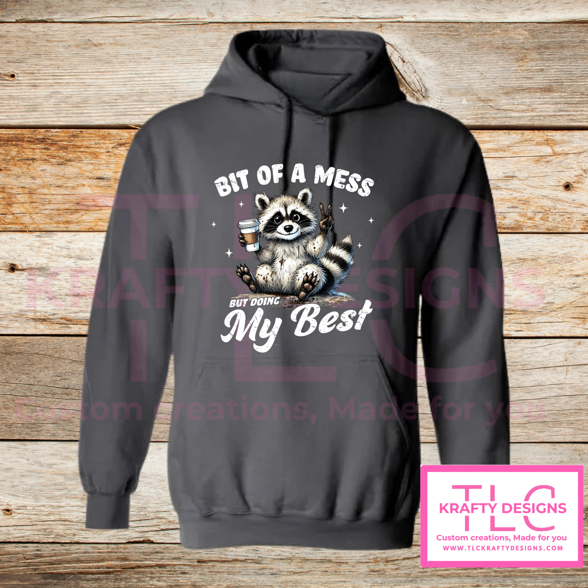 Bit of a Mess But Doing My Best – Funny Raccoon Hoodie or Crewneck LAST CHANCE