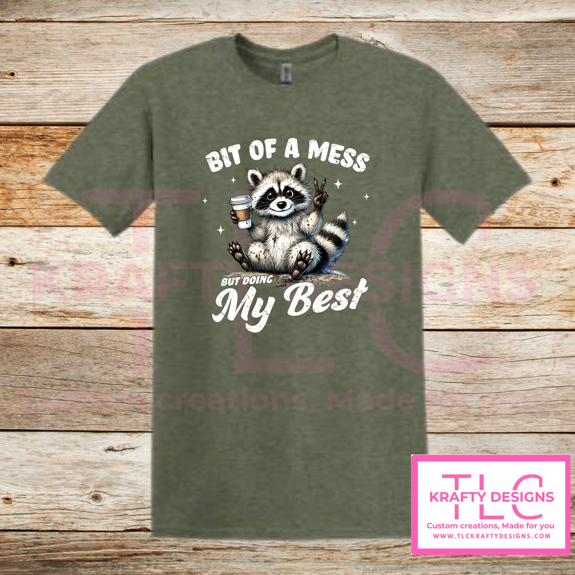 Own the chaos and keep it cute with this “Bit of a Mess But Doing My Best” raccoon tee! Featuring an adorable, slightly disheveled raccoon holding a cup of coffee and flashing a peace sign, this shirt is perfect for anyone embracing the hot mess life with humor and heart.