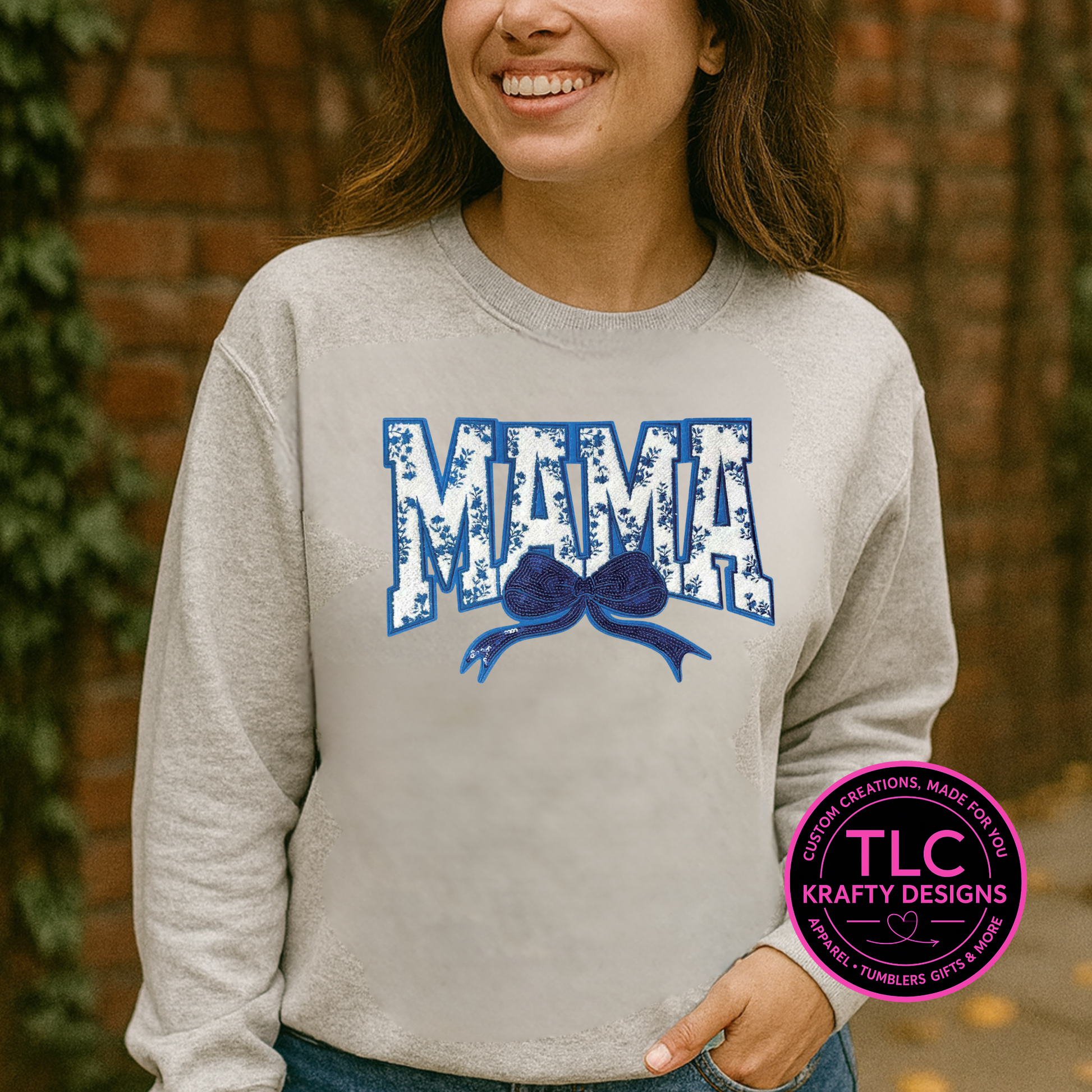 Celebrate motherhood with this "MAMA" patch featuring delicate blue floral detailing and an adorable blue sequin bow . Perfect for personalizing jackets, bags, sweatshirts, or any fabric project, this versatile appliqué combines soft chenille with shimmering sequins for eye-catching dimension. Choose iron-on or sew-on application based on your preference. A fun, heartfelt way to show mama some love and add a touch of sparkle to everyday items.