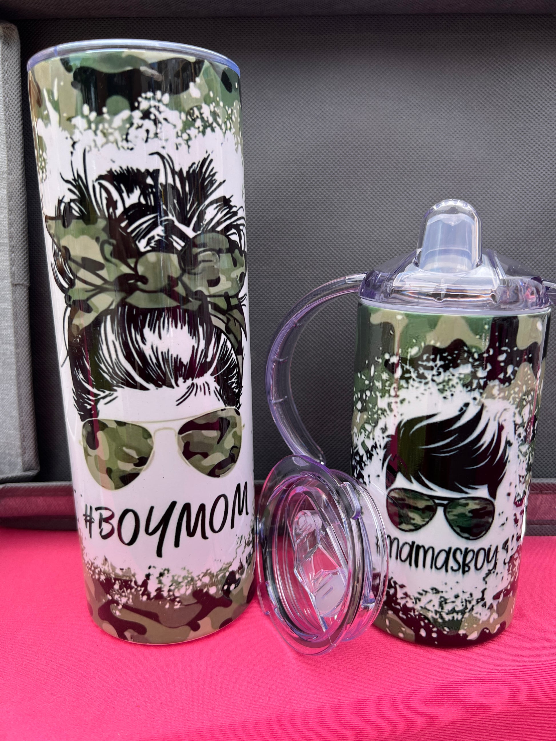 Set comes with a 20oz tumbler for Mom and a 12oz sippy cup with replacement big kid lid or a 12oz flip cup.