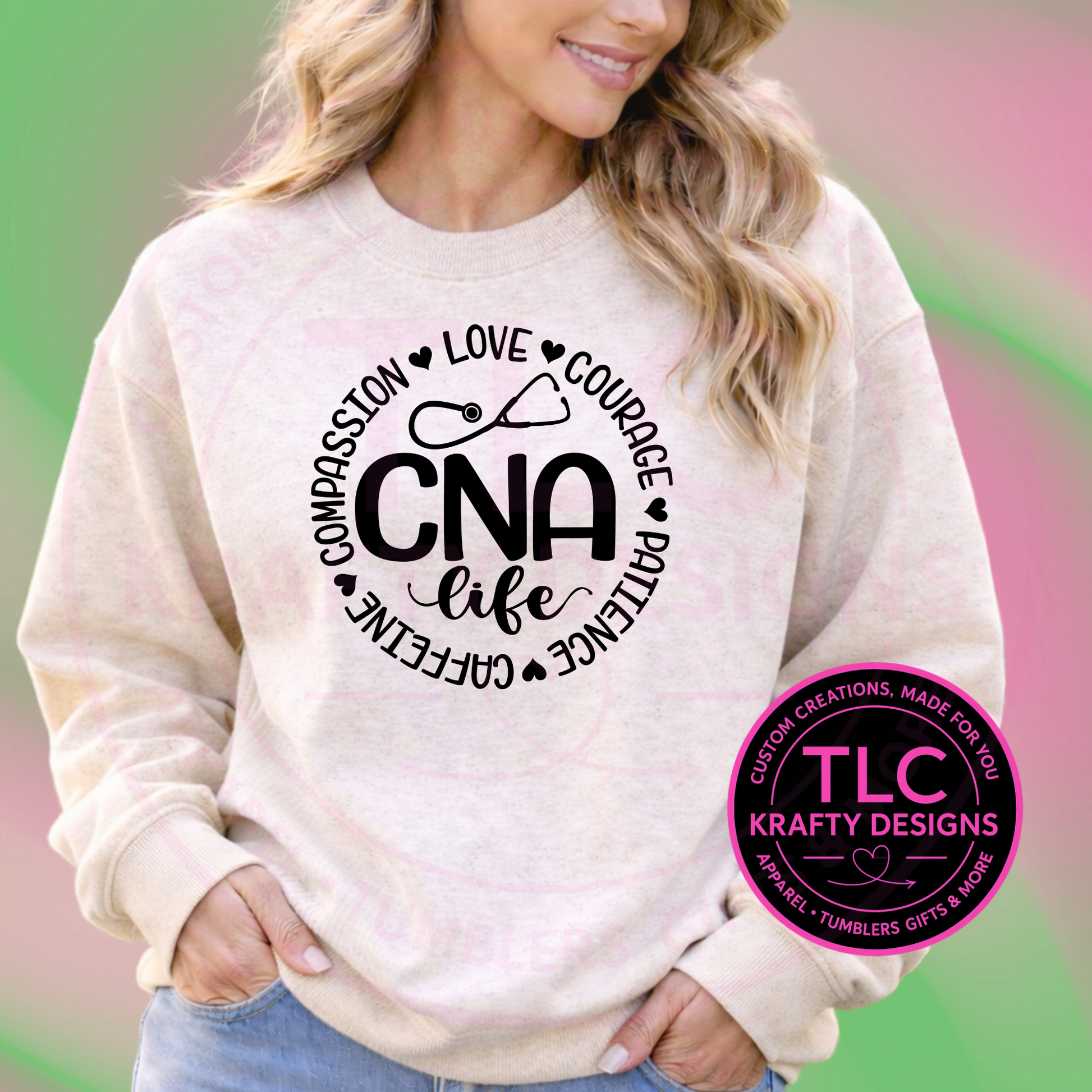 Show your pride in caregiving with this CNA T-Shirt or Sweatshirt featuring a bold circular “CNA Life” design surrounded by the words compassion, love, courage, patience, and caffeine, accented with heart and stethoscope details. Meaningful and stylish, this design celebrates the heart of caregiving and is perfect for workdays, casual wear, or gifting a dedicated Certified Nursing Assistant.