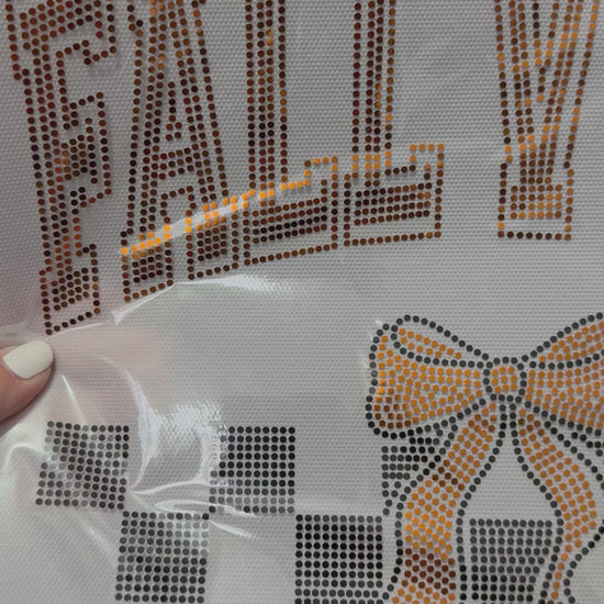 Bring the sparkle to your seasonal styles with this bold spangle design, featuring oversized varsity-style lettering and a coordinating bow detail. Designed to shimmer and catch the light, this piece is perfect for fall apparel, game day looks, and custom statement pieces.