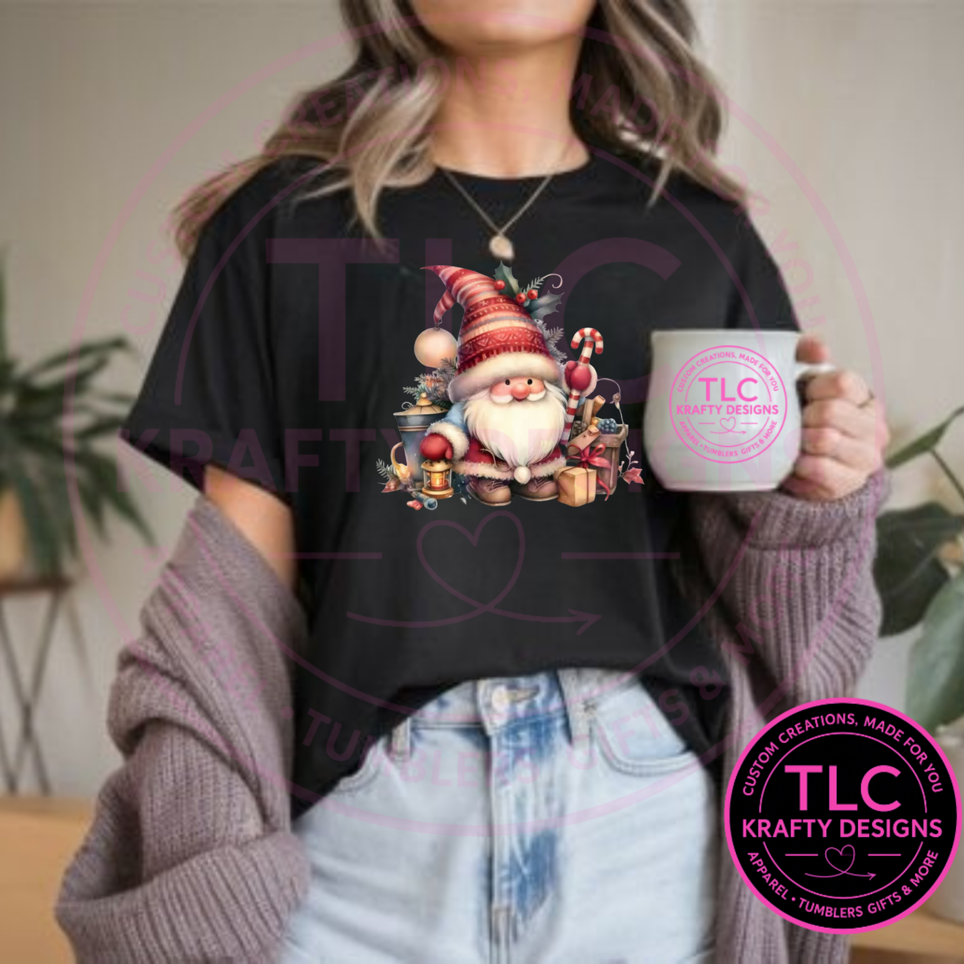 Get into the holiday spirit with this adorable Cozy Christmas Gnome Tee. Featuring a sweet gnome in a striped hat surrounded by gifts, candy canes, and festive greenery - it's the perfect mix of cute and cozy. Whether you're wrapping presents, sipping cocoa or enjoying a winter movie night, this long or short sleeve tee will keep your holiday style merry and bright.
