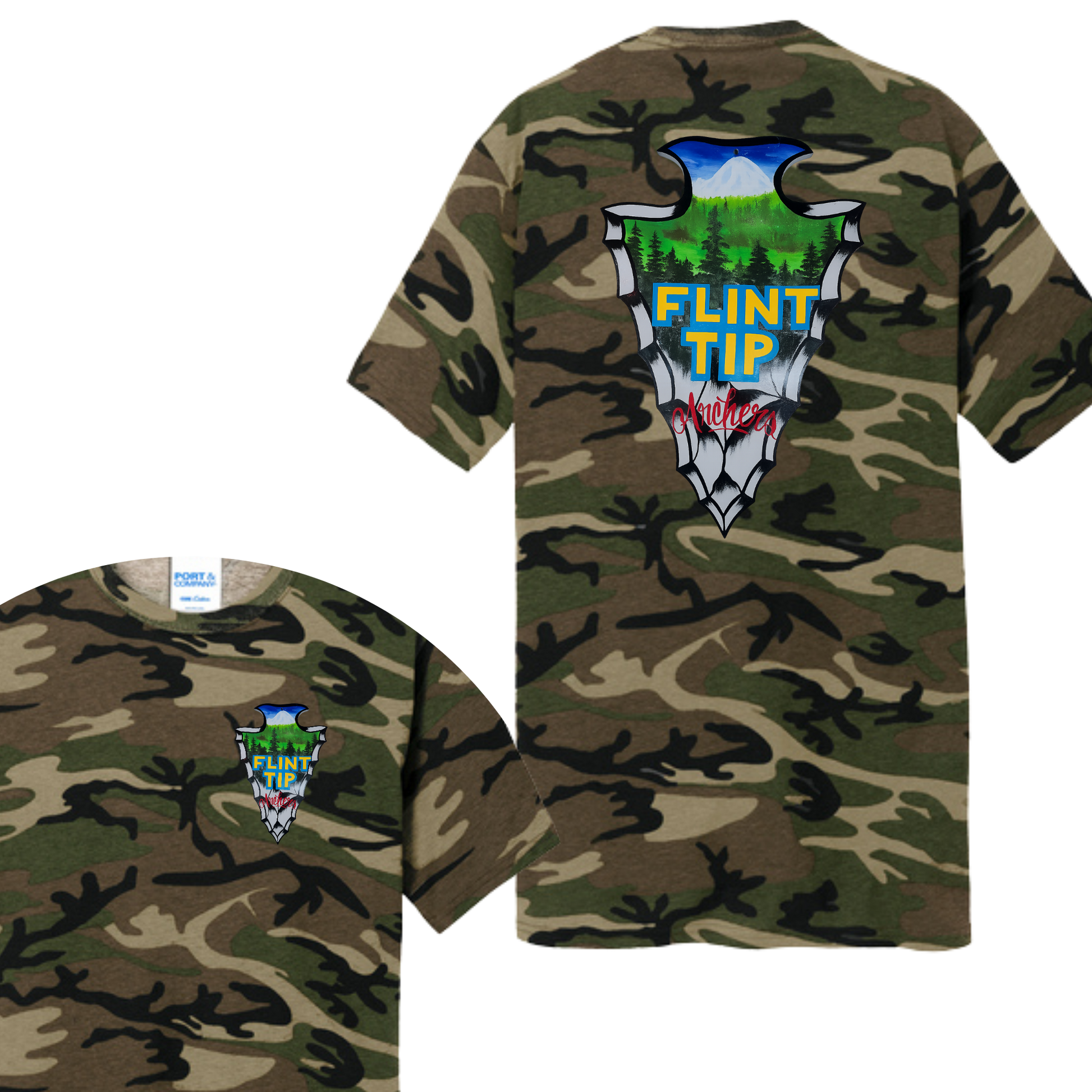 Blend into the wild in style with this Flint Tip Archery Camo T-Shirt, featuring a bold custom arrowhead graphic on both the front and back. Show off your love for the outdoors, archery, and adventure with this rugged, woodland camo shirt—perfect for competitions, range days, or just repping your team.