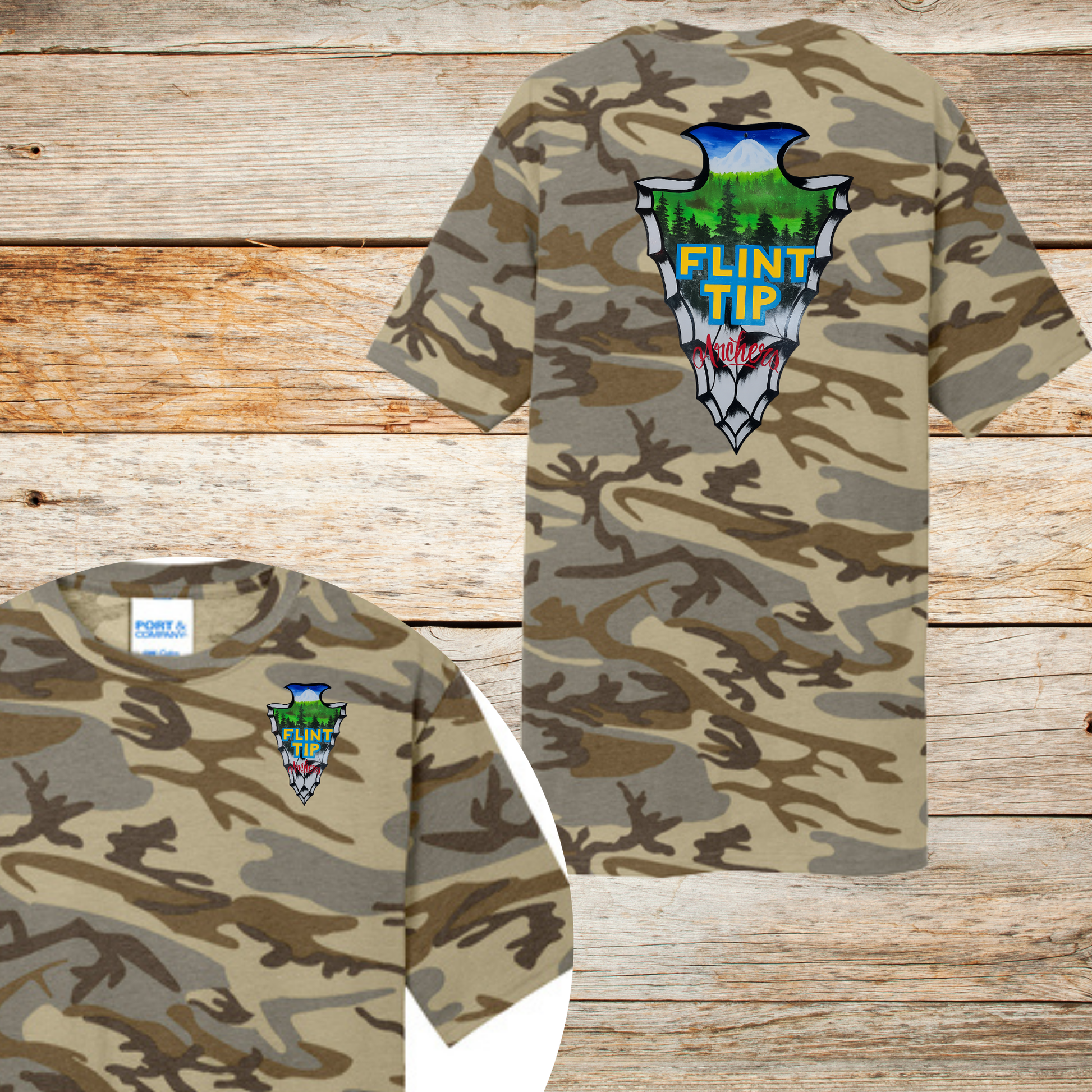 Flint Tip Archery Camo T-Shirt – Outdoor Sportswear with Custom Arrowhead Design