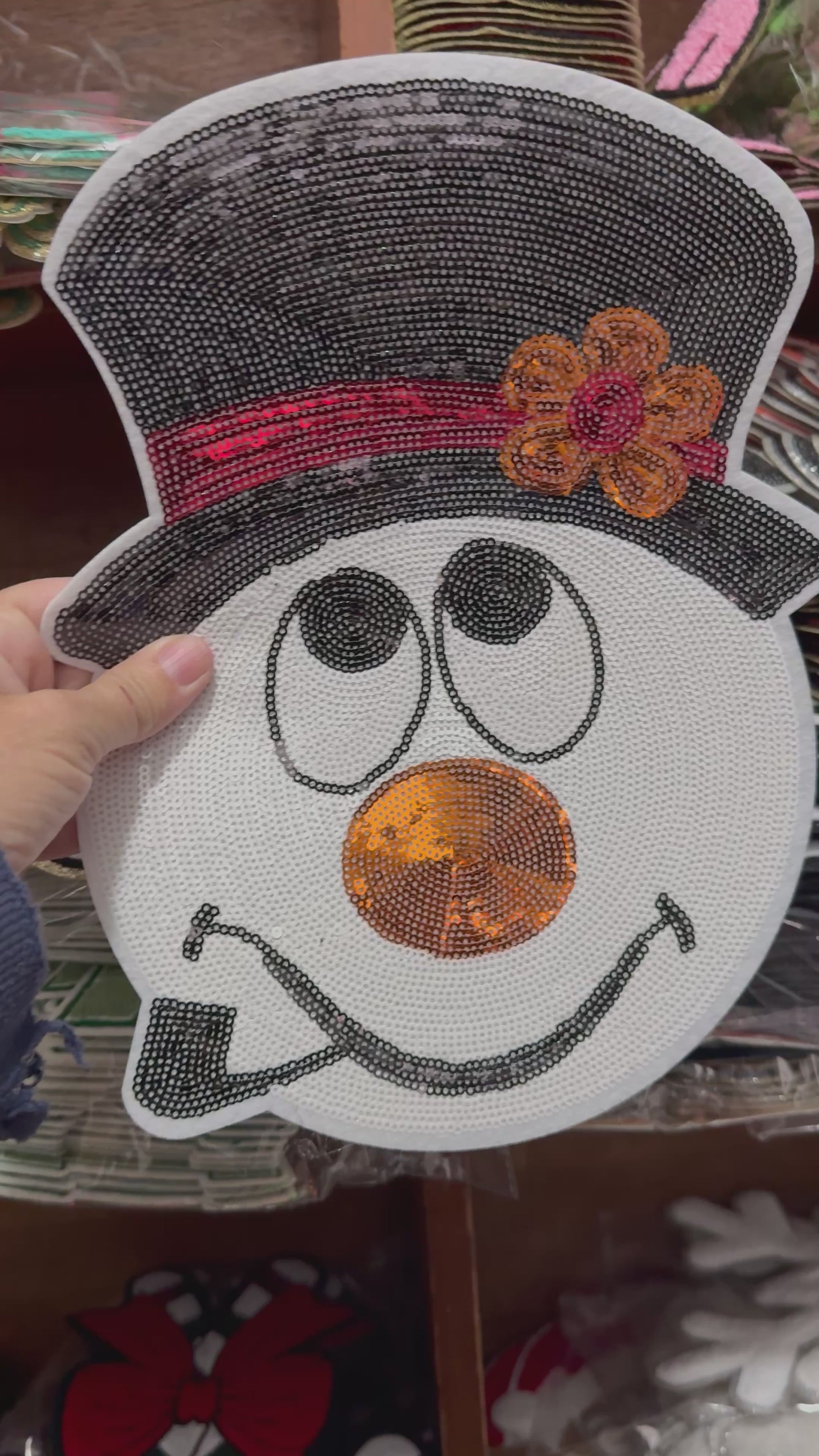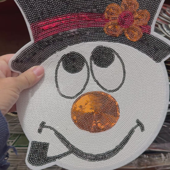 Add some sparkle and holiday cheer to your favorite apparel or accessories with this adorable Frosty Snowman sequin patch! Featuring shimmering sequins, a cheerful smile, and a festive top hat, this oversized patch is perfect for winter lovers and crafters alike