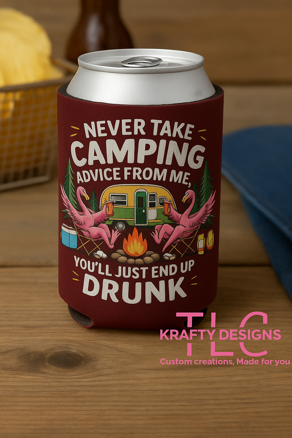 Funny Camping Koozie – Flamingo “Never Take Camping Advice” Can Cooler – Outdoor Beer Sleeve – RV Life Gift – Drunk Campfire Vibes