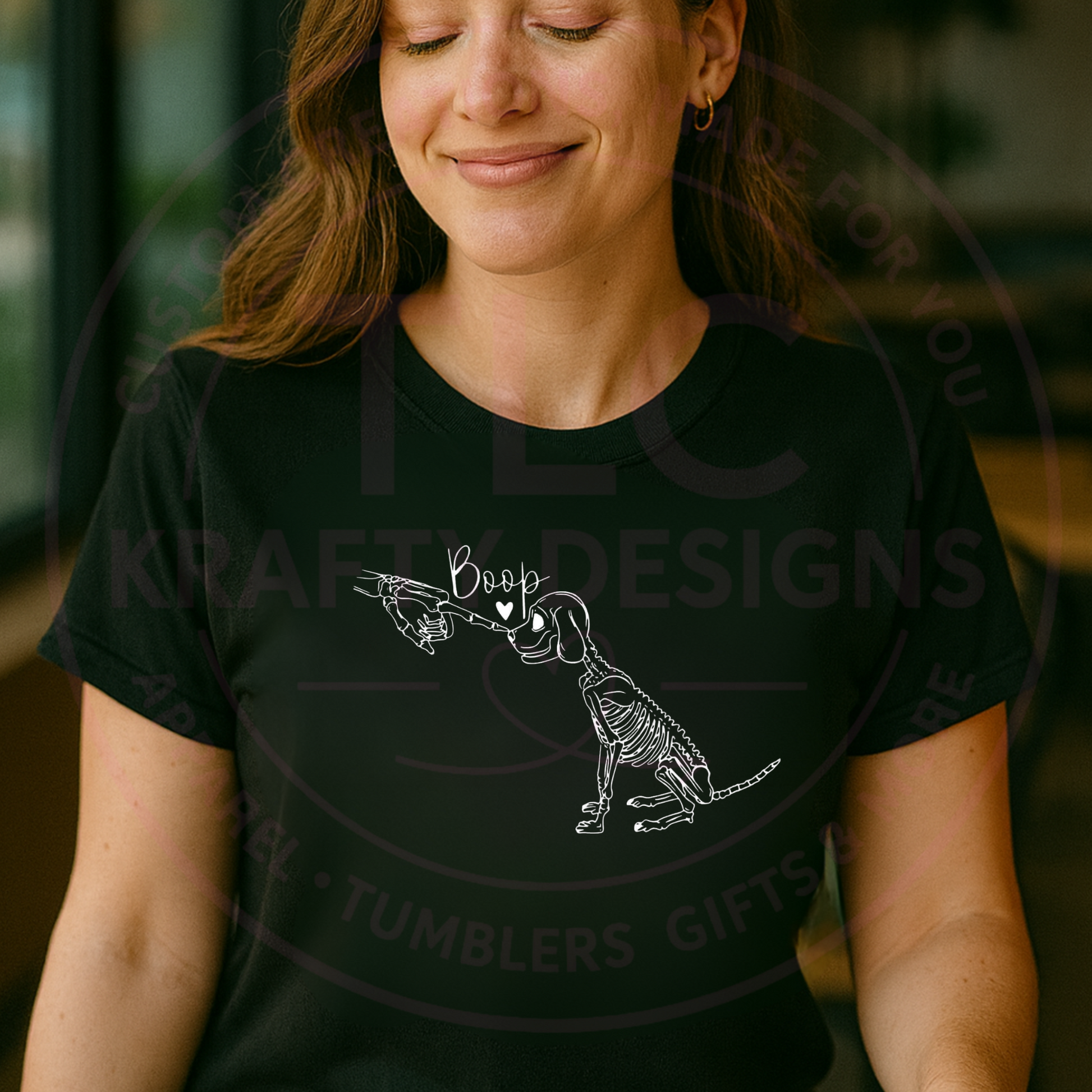 Funny Skeleton Dog Shirt – “Boop” Dog Nose Graphic Tee | Short Sleeve or Long Sleeve | Halloween Dog Lover Gift