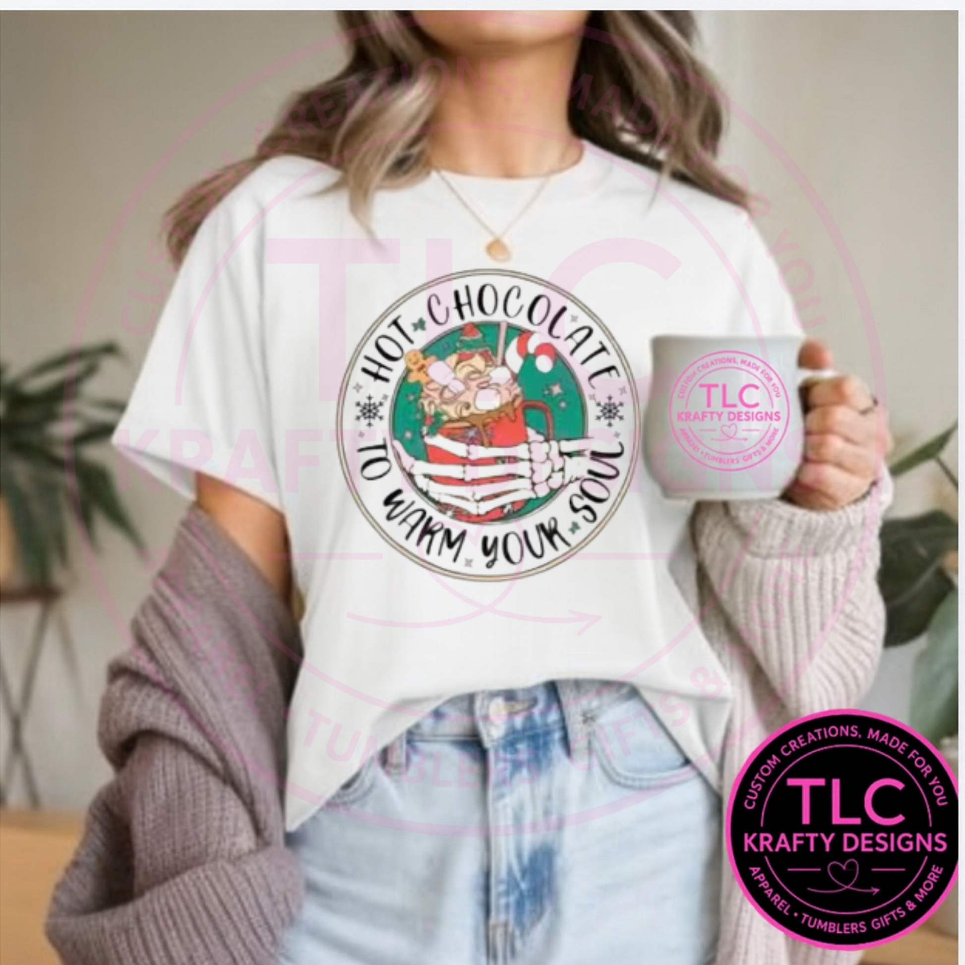 Embrace the spooky side of the season with this playfully creepy tee featuring a skeleton hand clutching a steaming mug of festive hot chocolate. Complete with "Hot Chocolate to Warm Your Soul" and festive snowflakes, this tee is perfect for those who love their holidays with a twist of dark humor, combining holiday cheer with gothic charm. Available in both long and short sleeve options, it's an ideal pick for Christmas parties, casual winter wear, or anyone who appreciates quirky seasonal style. Cozy vibes meet skeletal shenanigans in one unforgettable shirt.