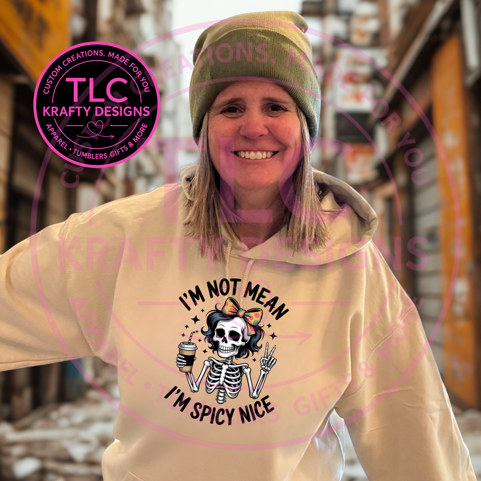 - Skeleton graphic with bold “I’m Not Mean, I’m Spicy Nice” text