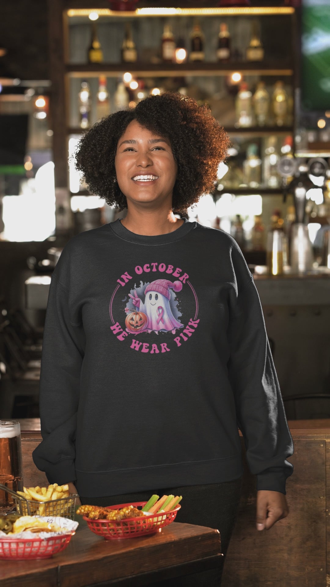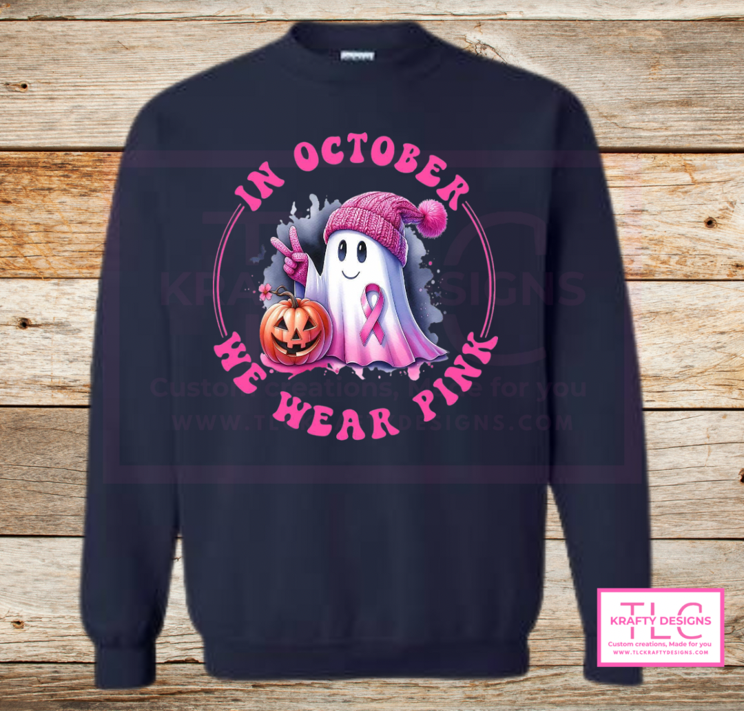 In October We Wear Pink Ghost Sweatshirt β Breast Cancer Awareness Halloween Sweatshirt β Pink Ribbon Support Apparel by TLC Krafty Designs