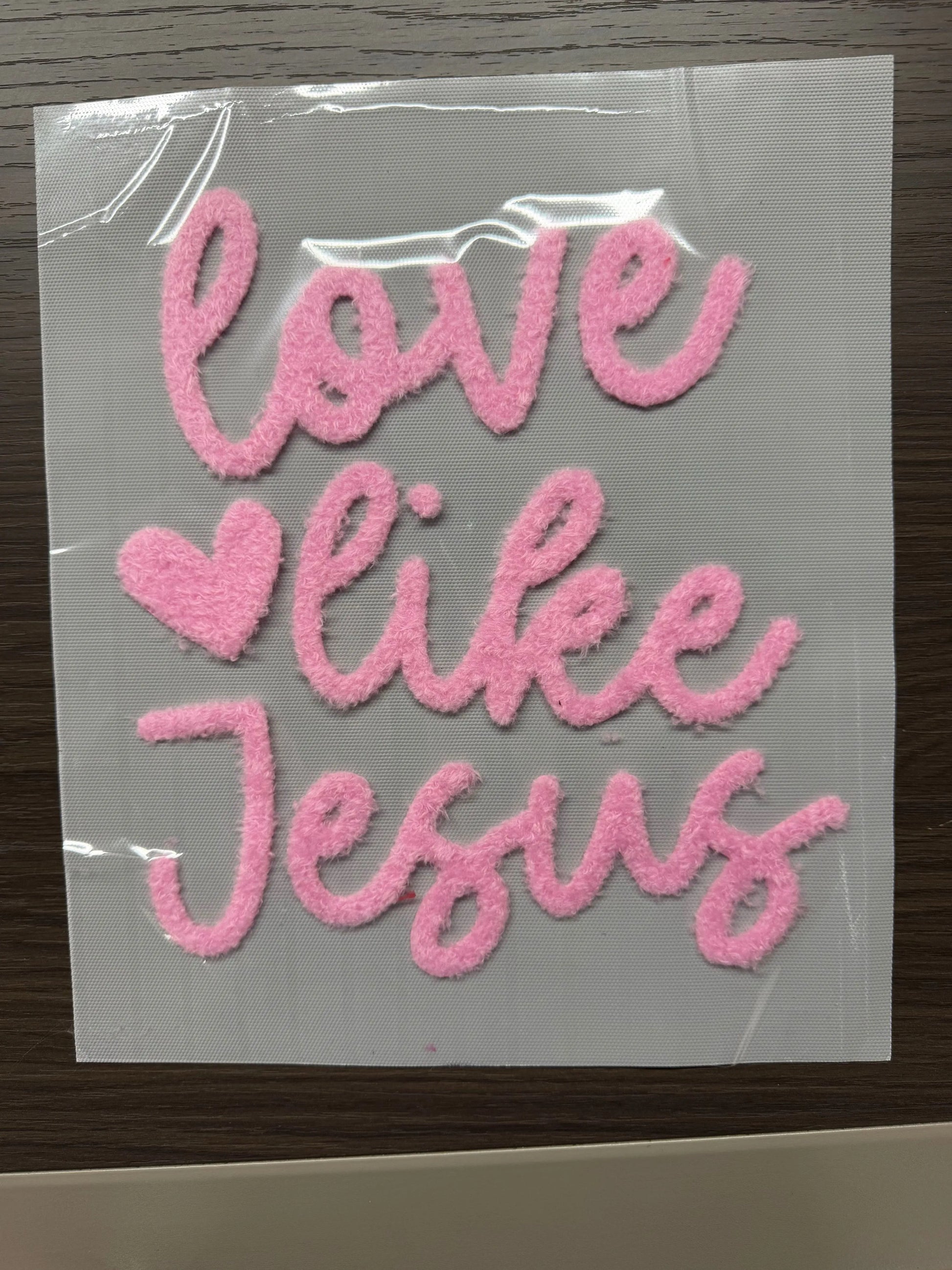 Spread love and faith with this “Love Like Jesus” fuzzy chenille design 💕
