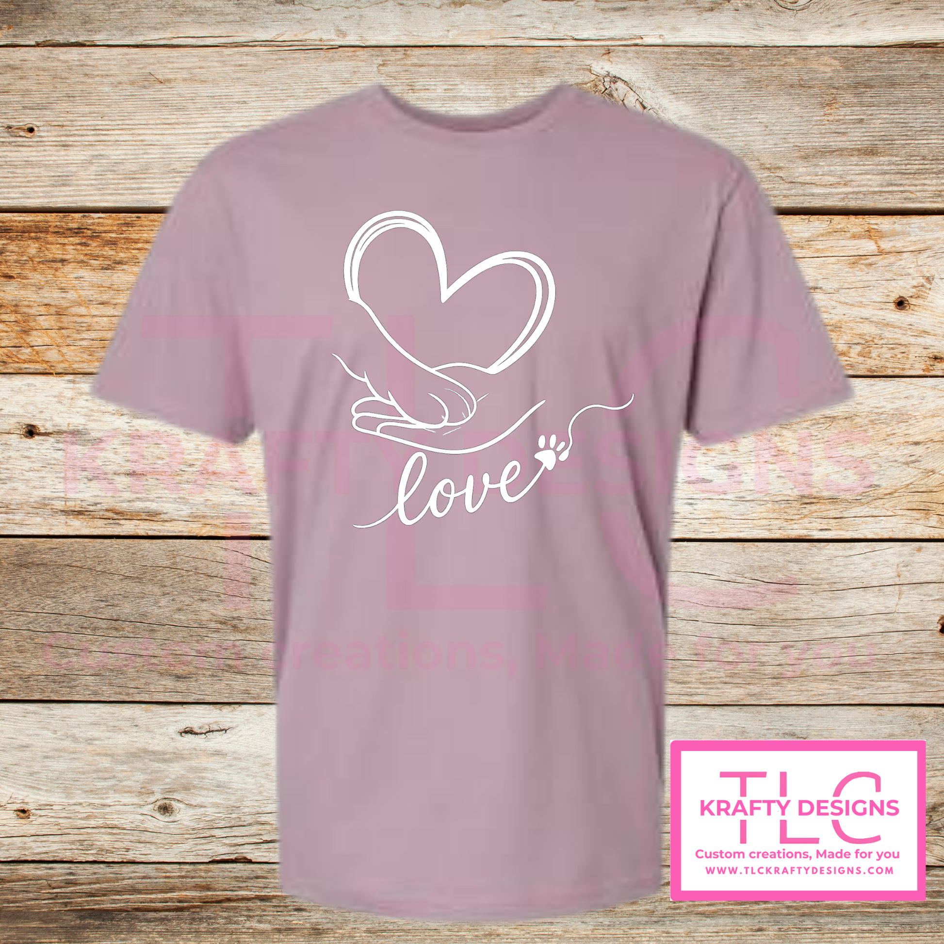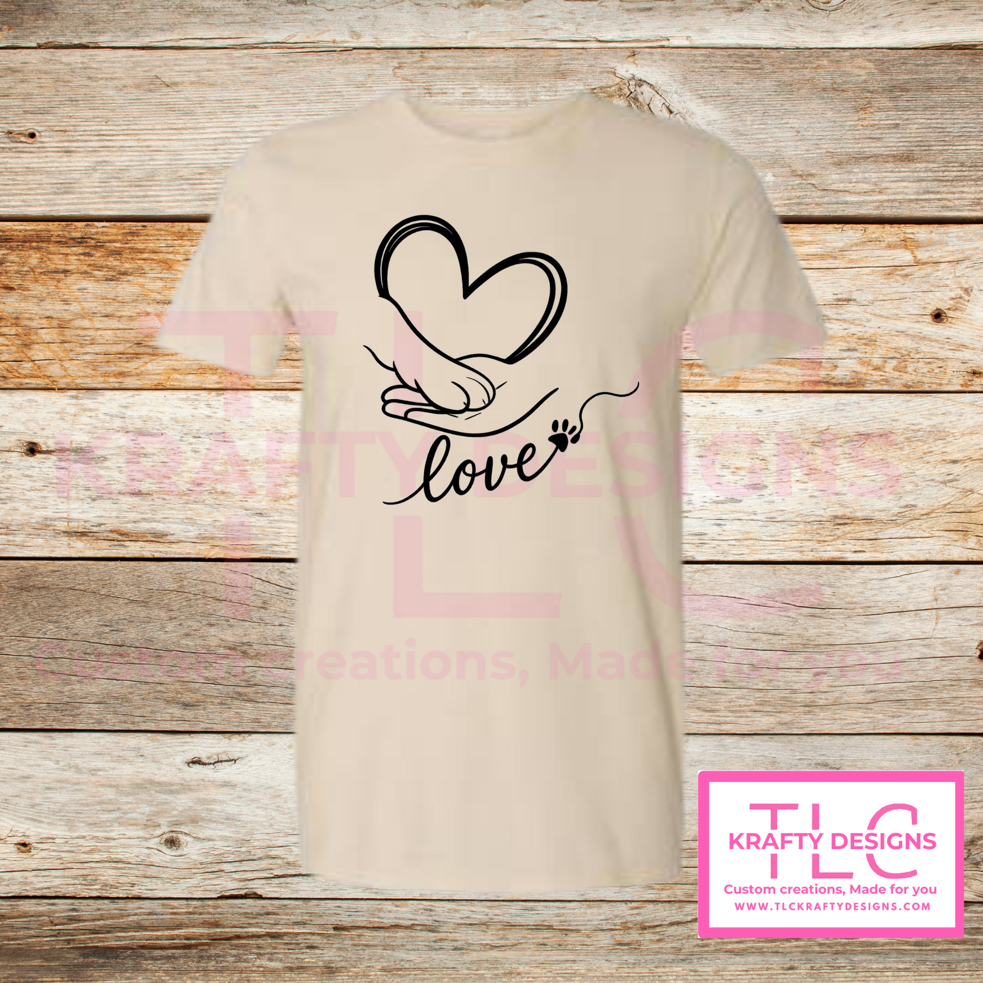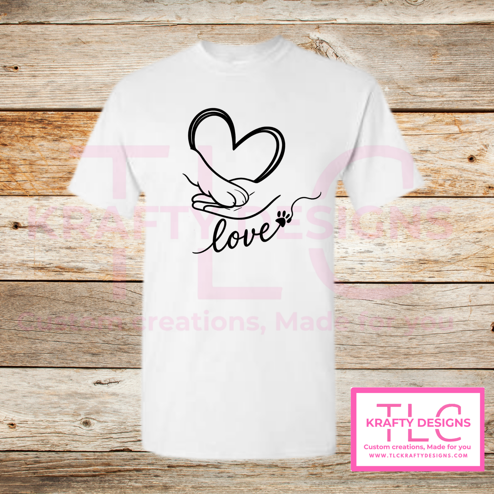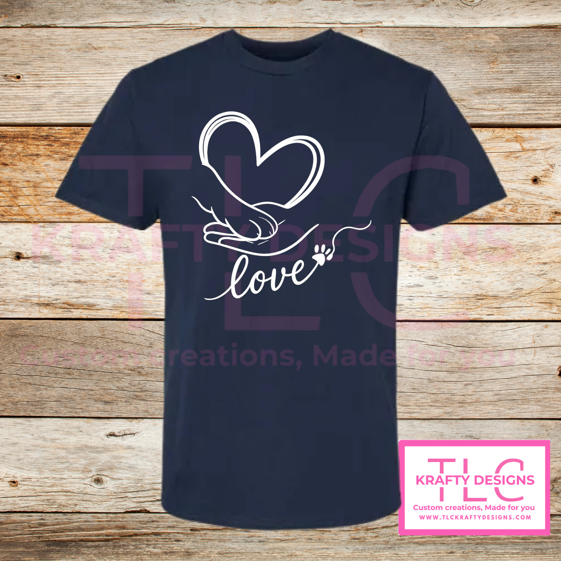 This heartfelt paw print tee is perfect for animal lovers who wear their heart on their sleeve—and their pet on their shirt! Featuring a minimalist heart formed by a hand and paw, plus the word “love” with a paw print accent, this shirt is a simple but powerful way to show your connection with your furry best friend.