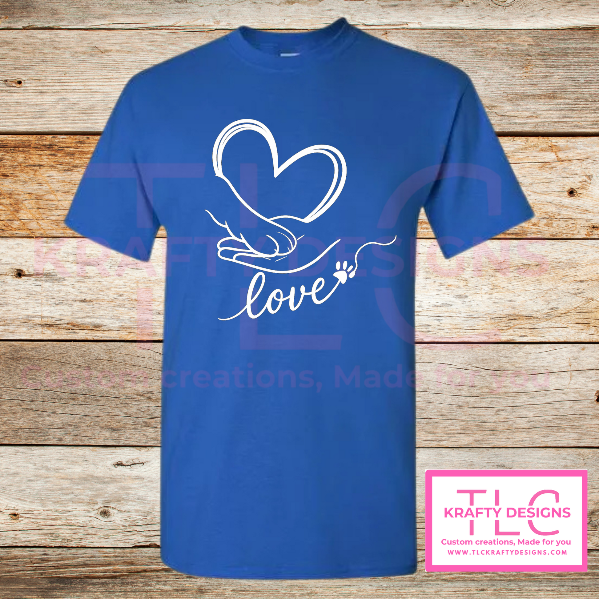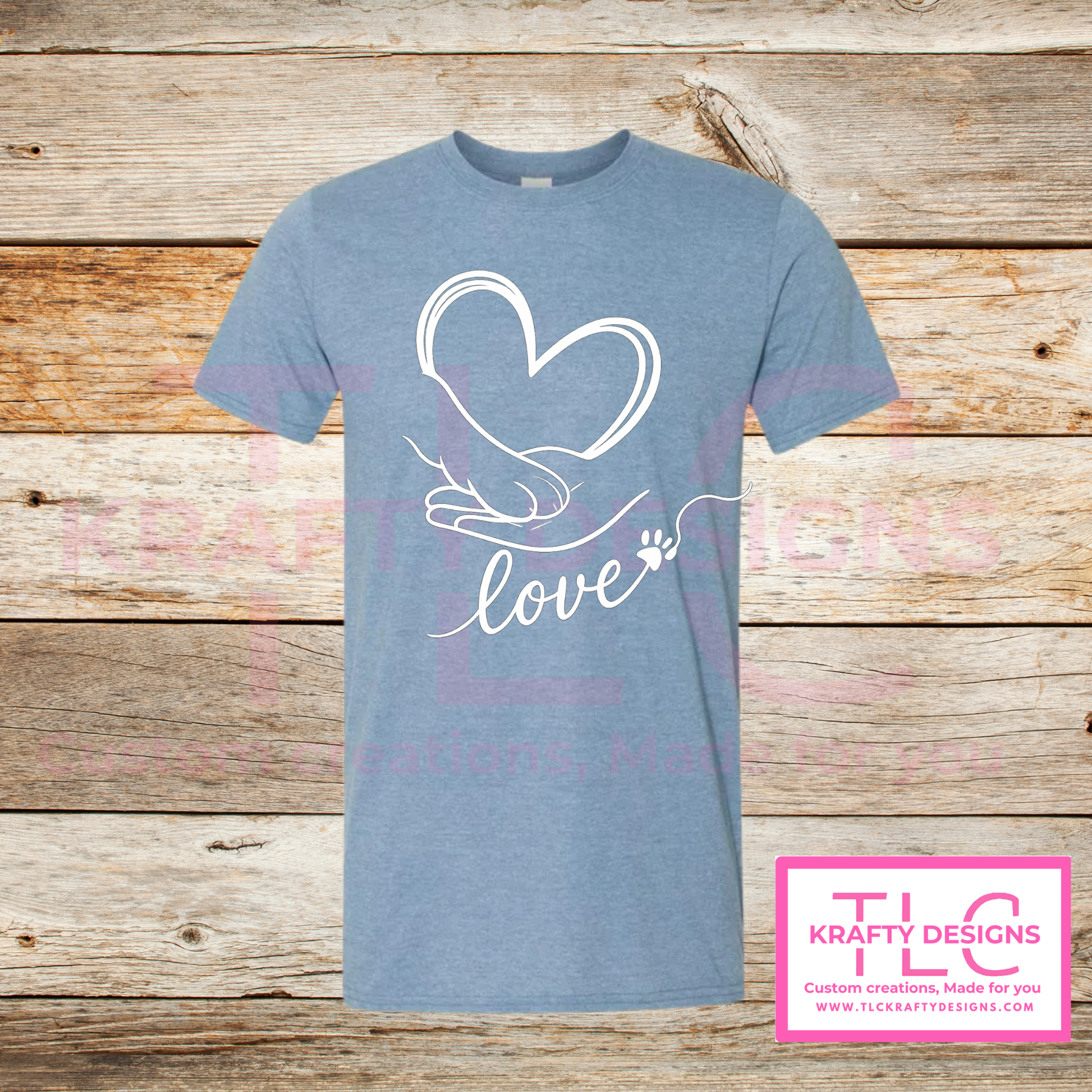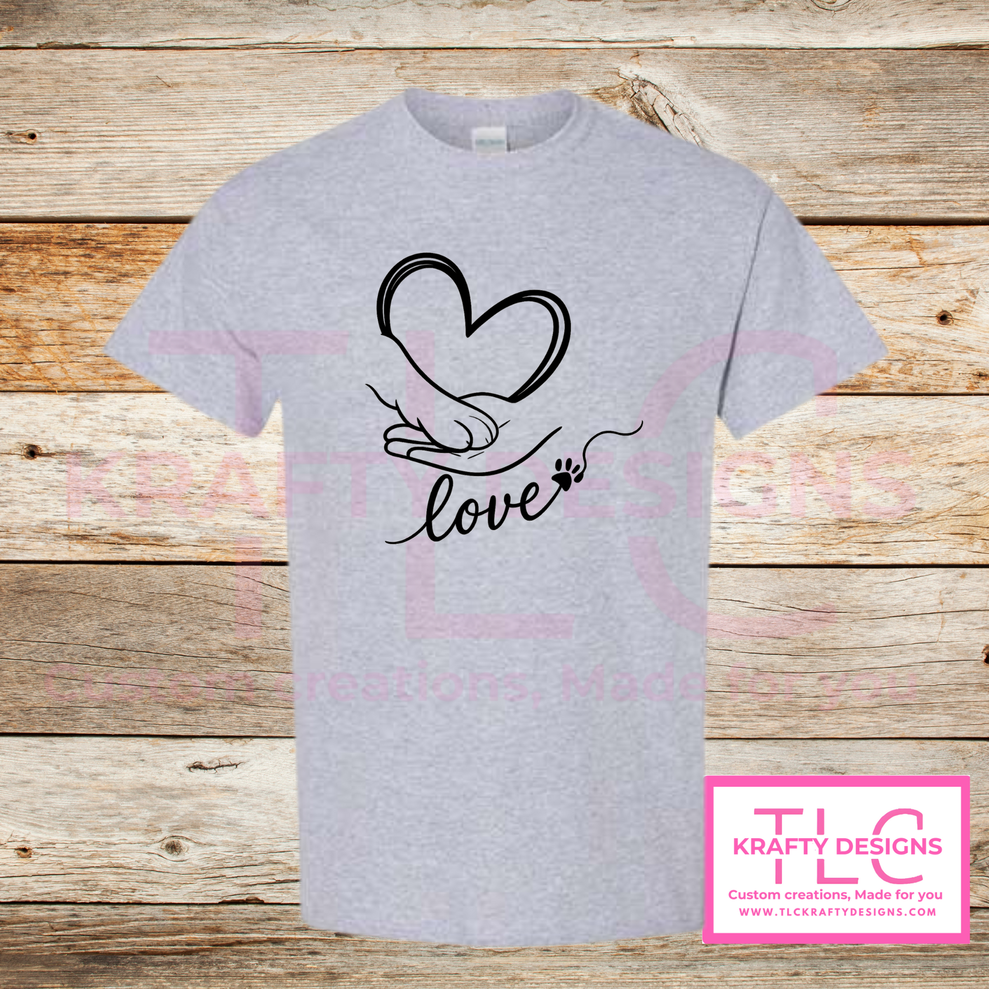 This heartfelt paw print tee is perfect for animal lovers who wear their heart on their sleeve—and their pet on their shirt! Featuring a minimalist heart formed by a hand and paw, plus the word “love” with a paw print accent, this shirt is a simple but powerful way to show your connection with your furry best friend.