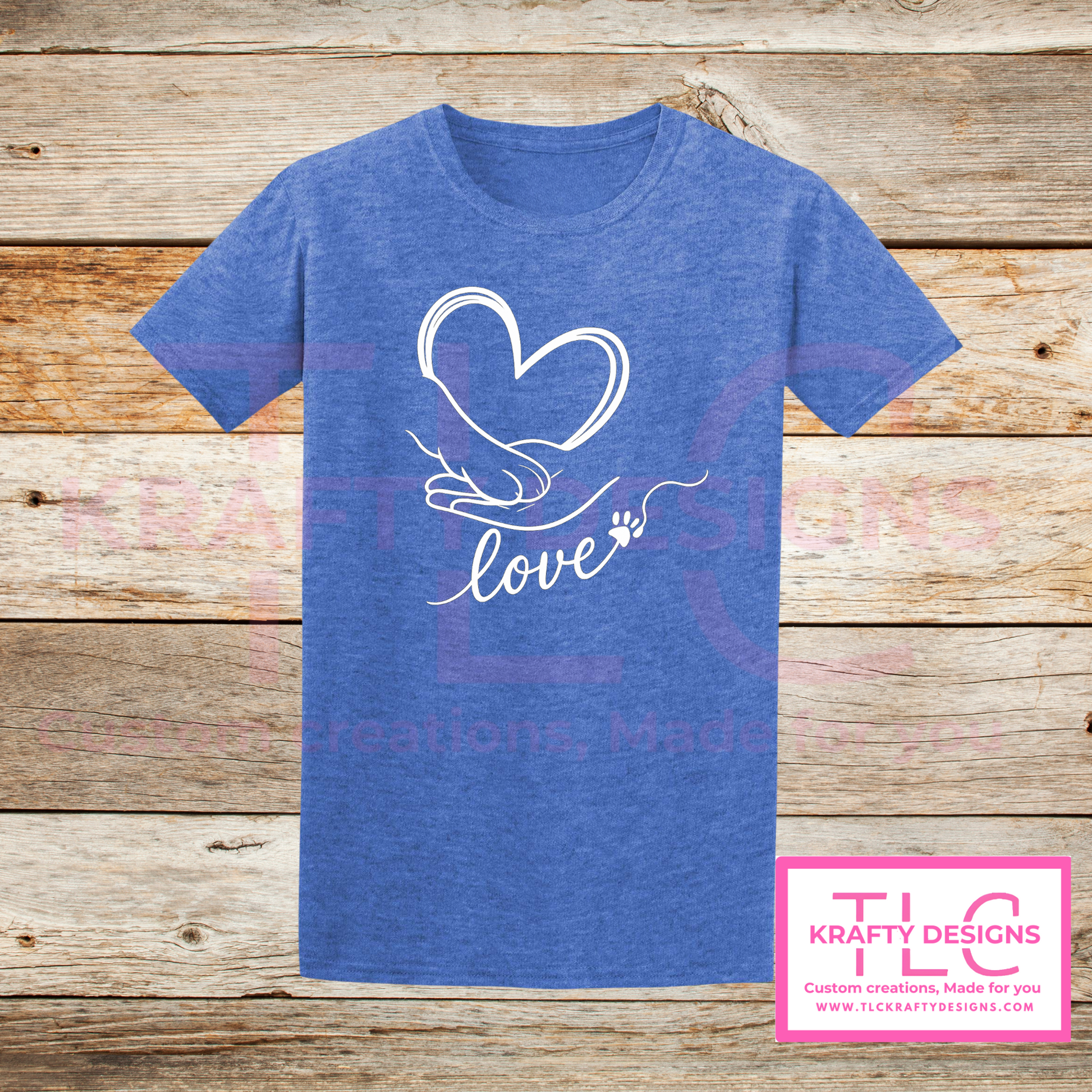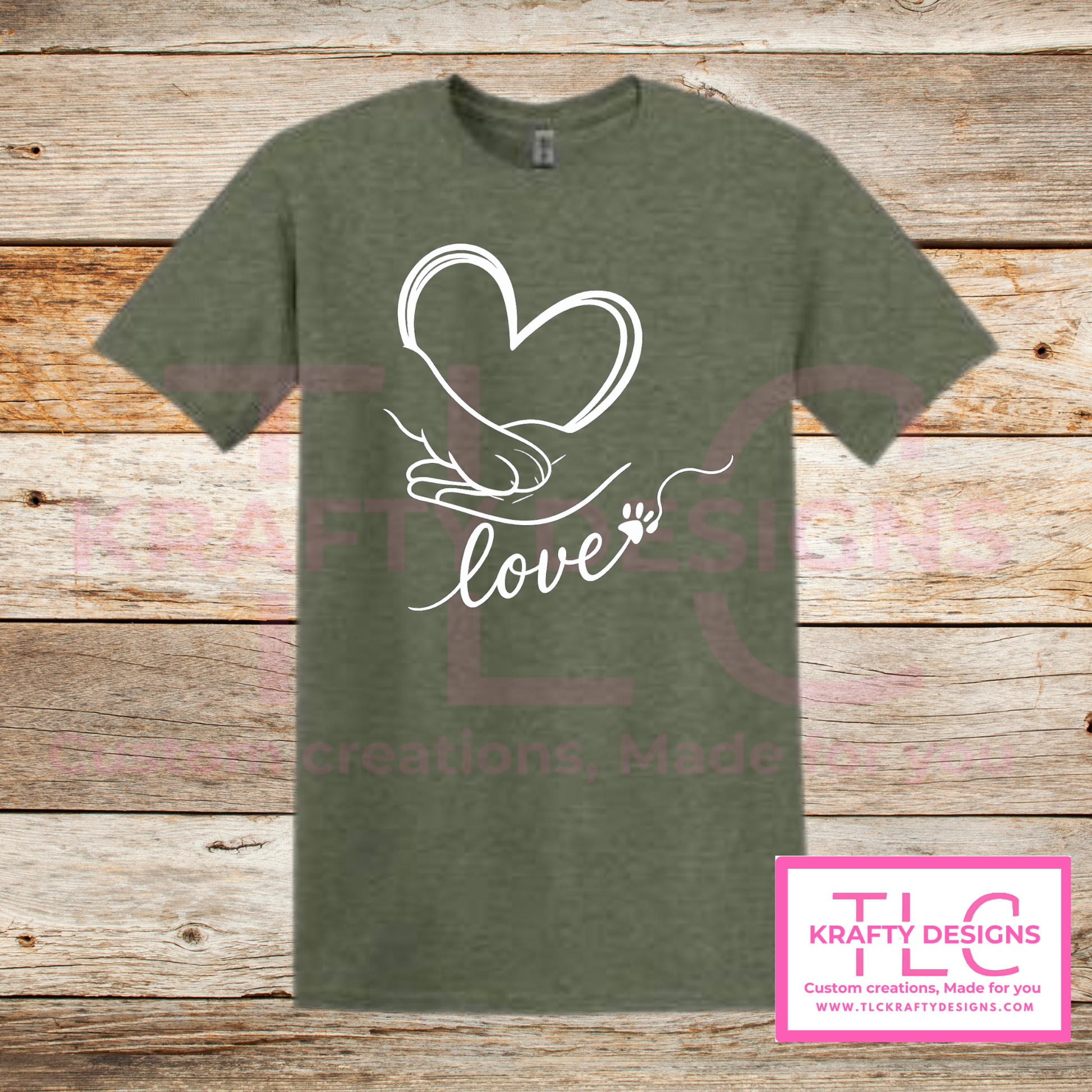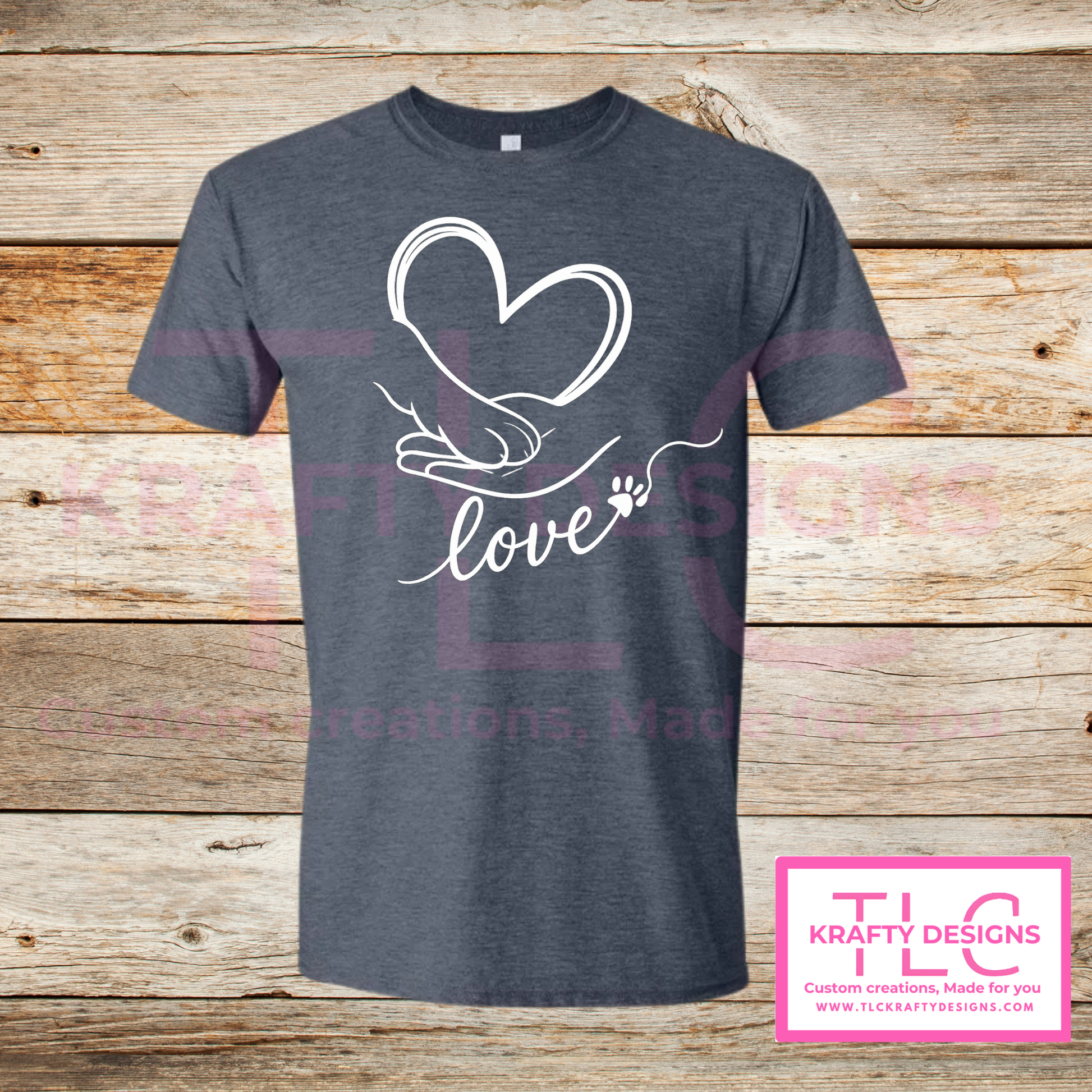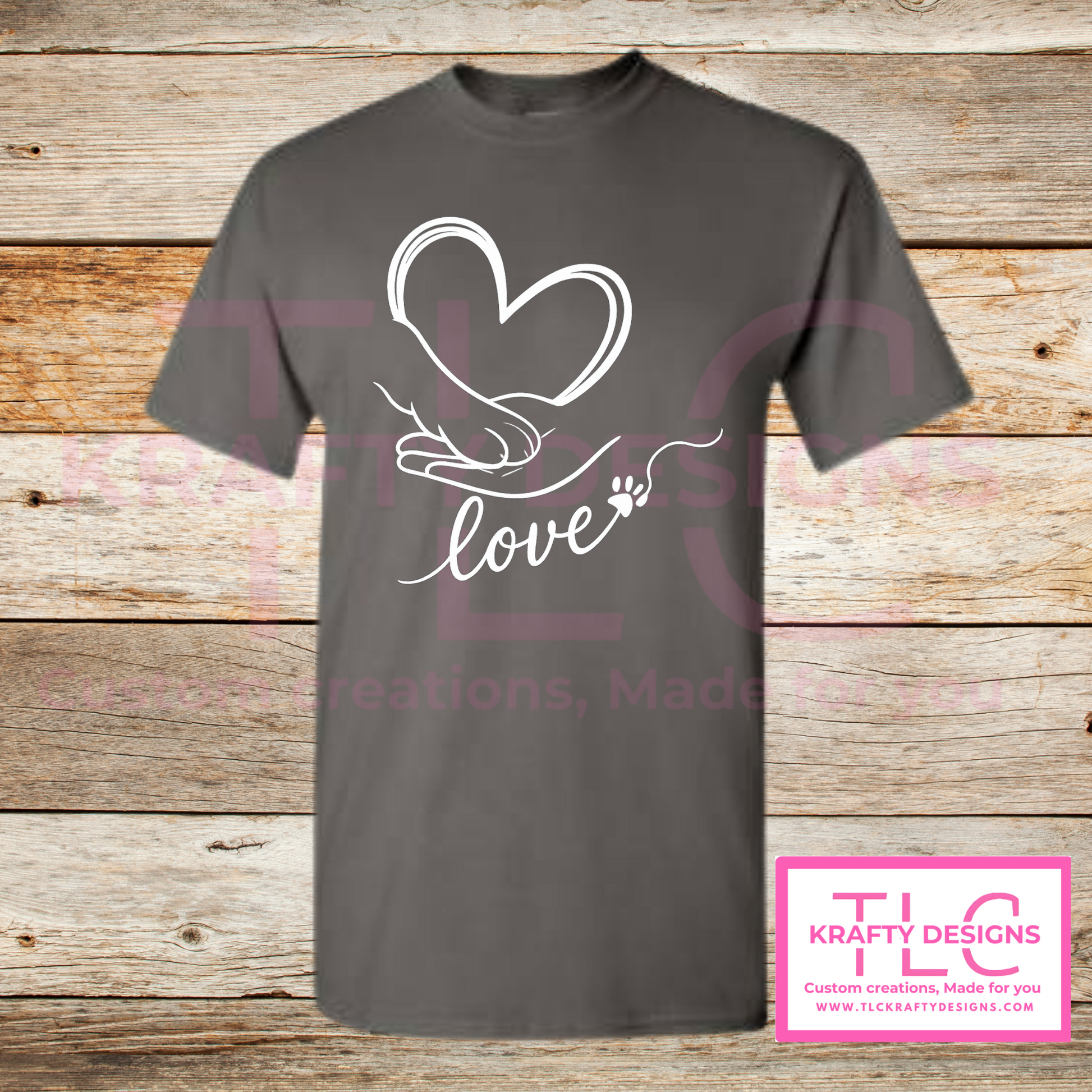 This heartfelt paw print tee is perfect for animal lovers who wear their heart on their sleeve—and their pet on their shirt! Featuring a minimalist heart formed by a hand and paw, plus the word “love” with a paw print accent, this shirt is a simple but powerful way to show your connection with your furry best friend.