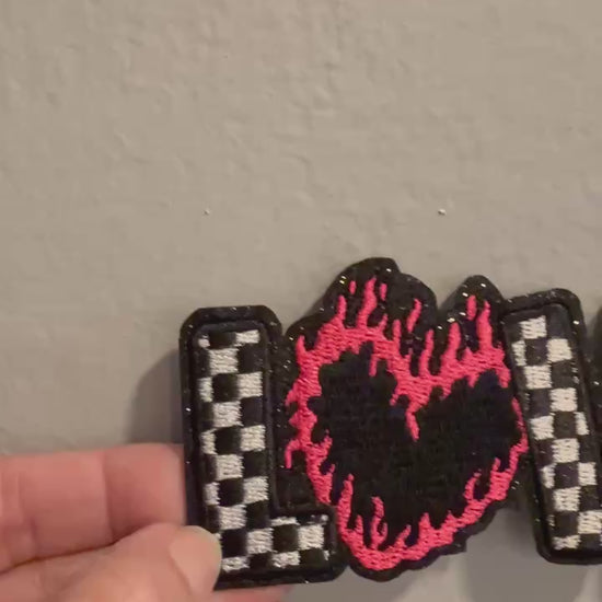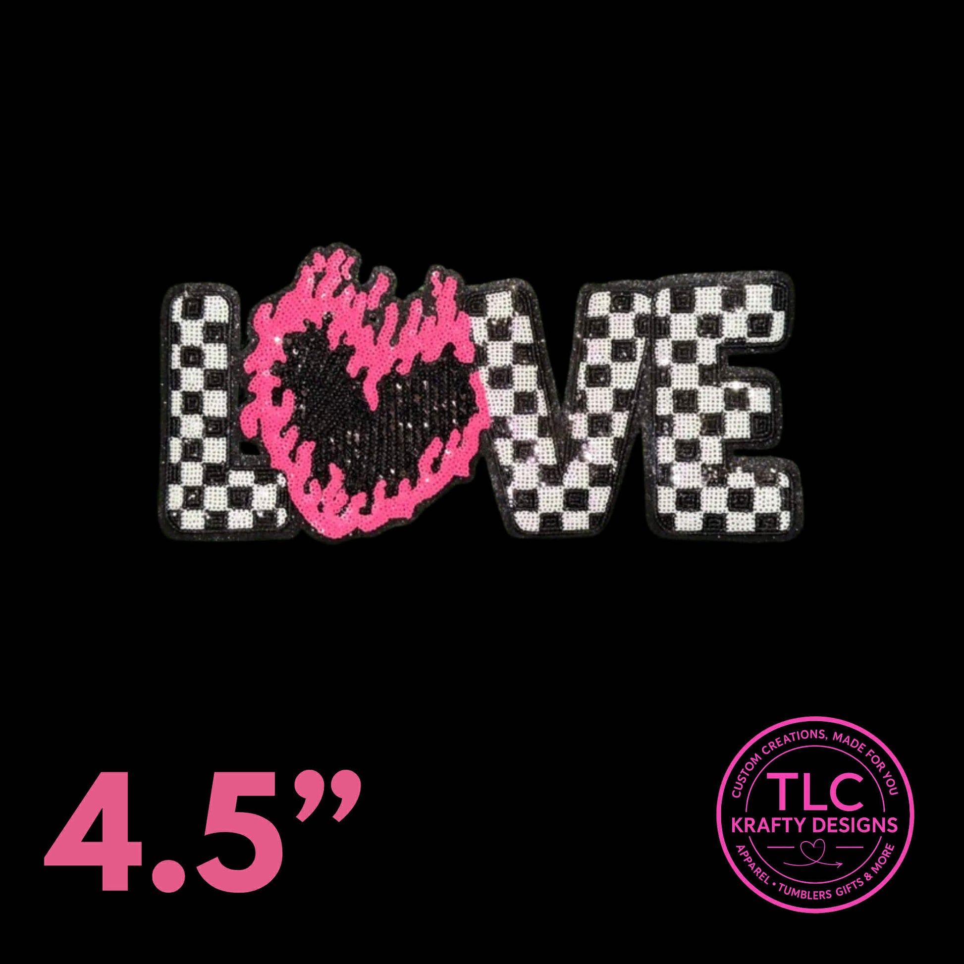 This eye‑catching patch features bold black‑and‑white checkered letters spelling LOVE, with a pink flame heart center for a fun, trendy statement. Sparkly, playful, and full of attitude, it’s perfect for customizing sweatshirts, jackets, denim, tote bags, and more. A must‑have accent for Valentine’s Day, game day, or everyday style.
