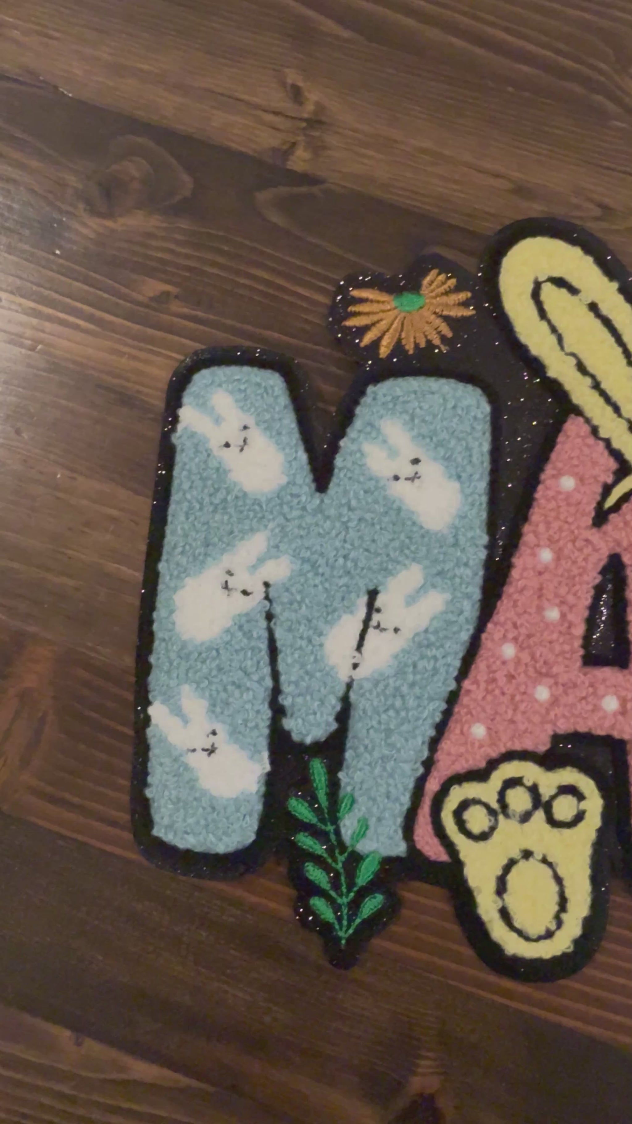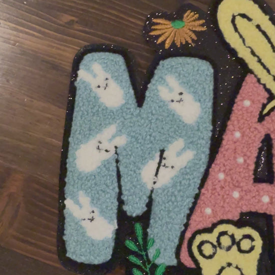This bold chenille design features playful spring details including bunny ears, florals, and soft pastel textures—perfect for Easter, springtime, or everyday mom wear.