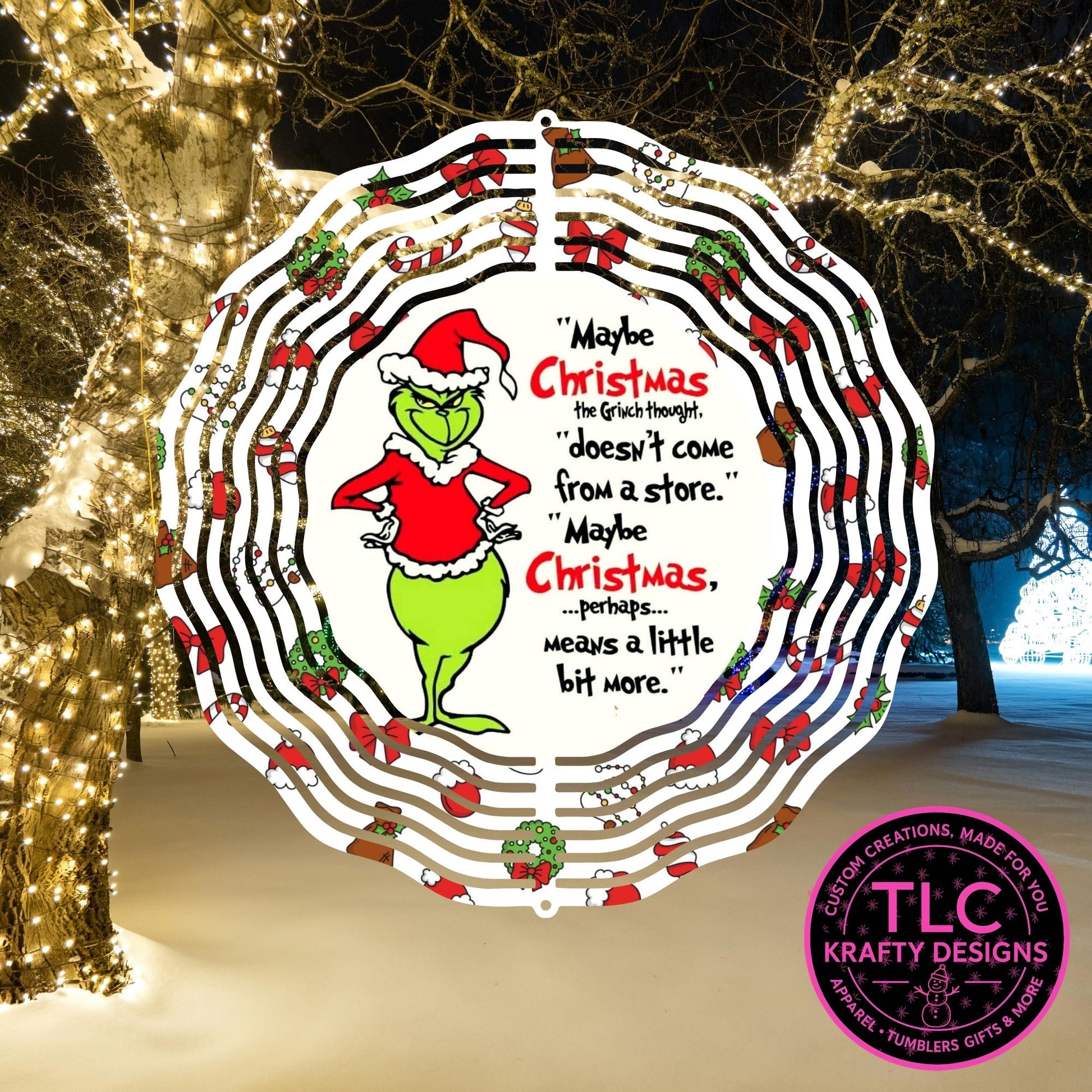 Capture the magic of the season with this delightful 10" Wind Spinner that celebrates what Christmas truly means! Blending Santa's warmth with the Grinch's quirky charm, this sublimated metal yard décor tells a story of holiday transformation and heart. Featuring delightful Christmas details around the outside edge, the vibrant colors and playful imagery remind everyone passing by that the best part of Christmas isn't about the decorations—it's about the meaning behind it all. Weather-resistant and built to enchant, this festive piece brings joy, laughter, and a touch of mischievous magic to your outdoor celebration.