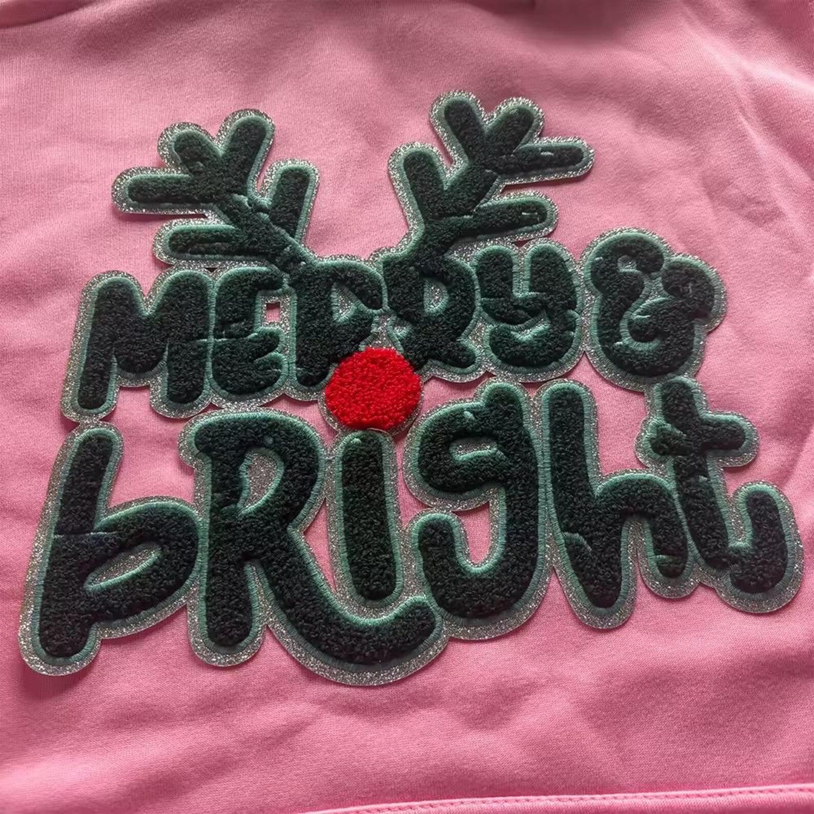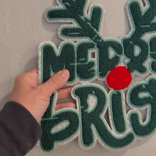 Add a touch of Christmas cheer to your holiday apparel or accessories with this adorable “Merry & Bright” reindeer chenille patch! Featuring soft green chenille lettering, sparkly silver edging, playful antlers, and a bright red nose, this festive design brings Rudolph-inspired charm to any project.