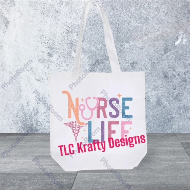 This white canvas tote bag features the phrase "Nurse Life" prominently displayed in stylish, bold lettering. Integrated into the design is a stethoscope emblem, which creatively wraps around or highlights the text, adding a professional and thematic touch. This tote bag is perfect for nurses who want to carry their essentials with pride and style. The durable canvas material ensures longevity, making it a practical choice for everyday use. The combination of the "Nurse Life" text and the stethoscope emblem beautifully symbolizes the nursing profession, making this tote an ideal accessory or gift for healthcare professionals.