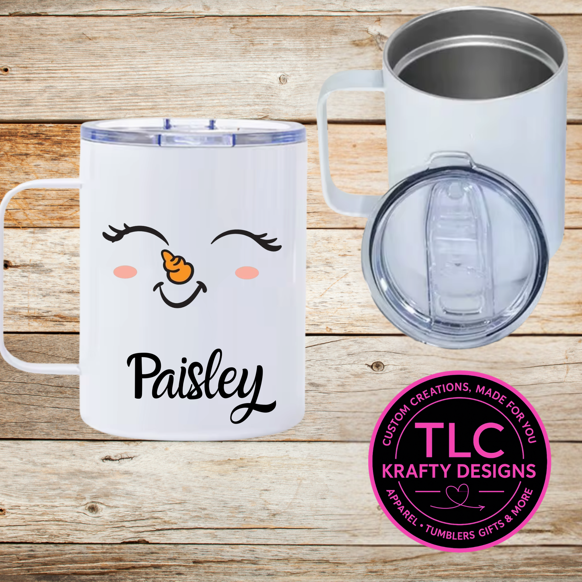 Make her holiday season extra special with this personalized girl snowman mug! Designed with sweet eyelashes, rosy cheeks, and a custom name, this 12oz insulated mug is perfect for hot cocoa, holiday treats, and cozy winter nights.