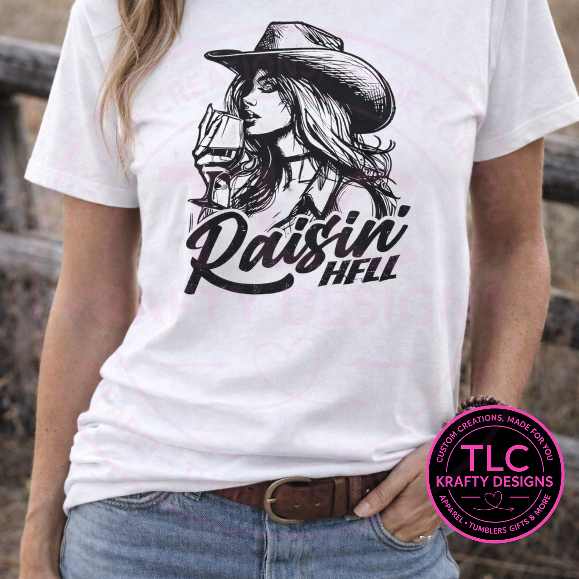 Turn heads in this bold Raisin’ Hell Cowgirl T-Shirt or Sweatshirt. Featuring a detailed western-inspired graphic of a cowgirl sipping wine with distressed lettering, this design blends country attitude with unapologetic confidence.
