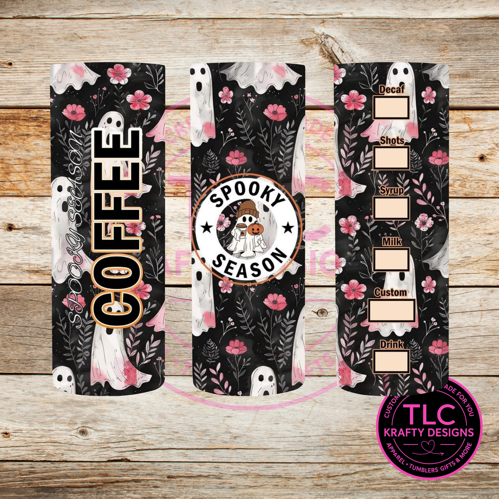 This adorable tumbler is perfect for all the spooky coffee lovers out there. Featuring cute ghosts, fall florals, and your favorite coffee checklist - it's the must have cup for your witchy brews this season!