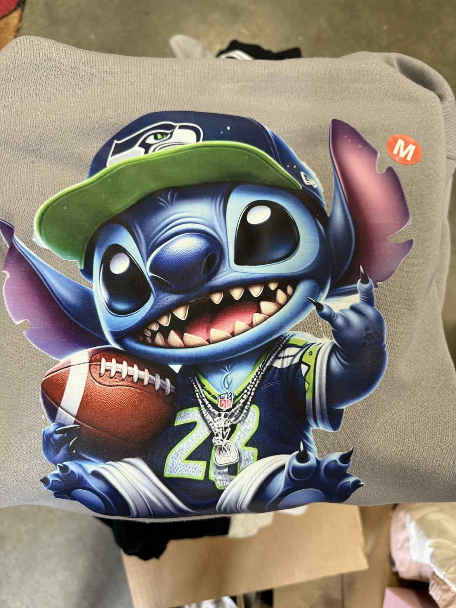 This cozy sweatshirt or hoodie features Stitch decked out in Seattle Seahawks gear, complete with a jersey, hat and football. Itβs the perfect way to stay warm and stylish while supporting your favorite team β whether youβre at the game, tailgating, or watching from home!
