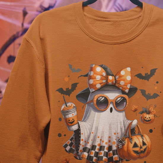 Trendy Halloween Ghost Hoodie β Cute Pumpkin, Coffee & Bat Design | Fall Sweatshirt for Women