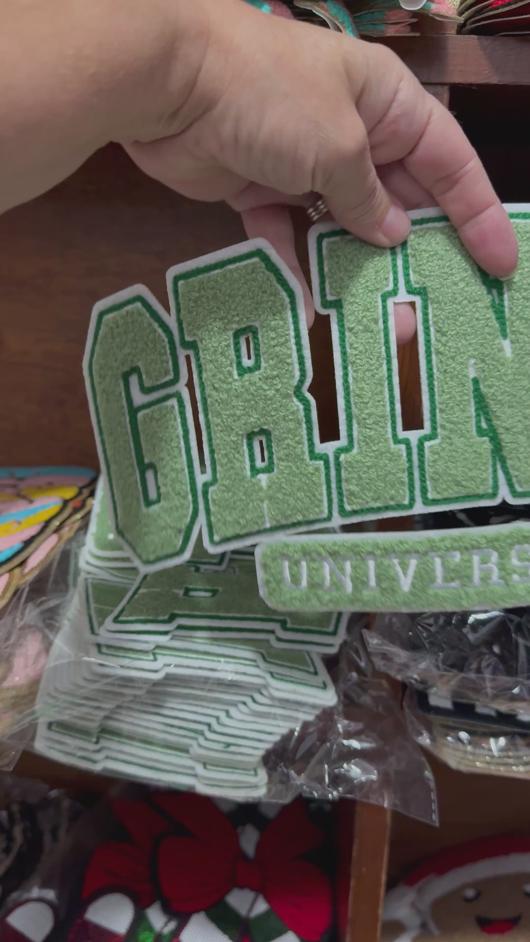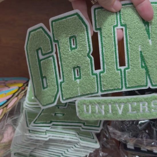 💚 Show your school spirit Grinch-style with this bold Grinch University chenille patch! Designed in classic varsity lettering, this patch is the perfect way to add festive fun with a touch of sass to your holiday wardrobe or DIY projects