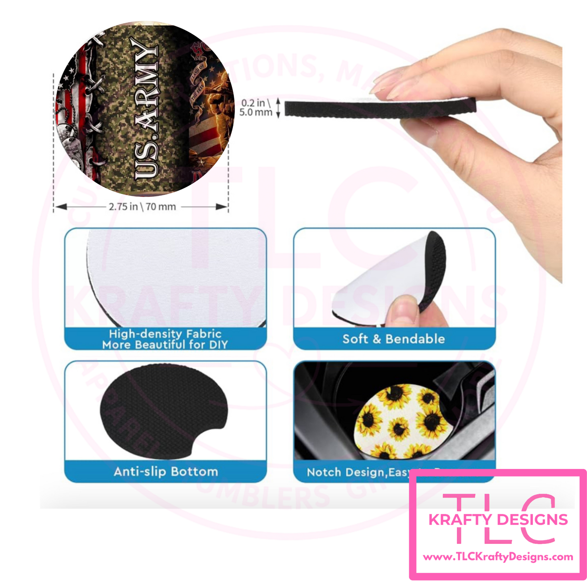 - Standard Car Coasters: Made from durable and absorbent Neoprene to help protect your car’s cup holders from spills and condensation.
