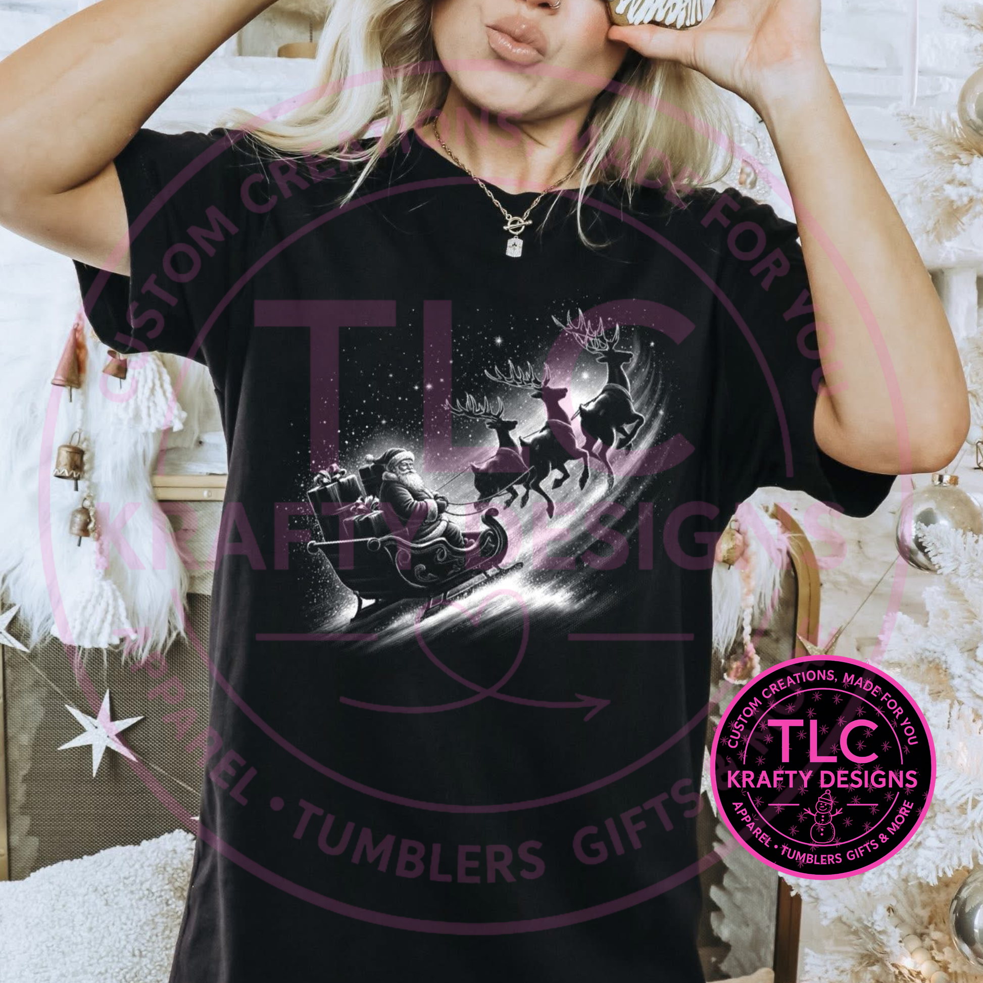 Wrap yourself in holiday magic with this whimsical vintage-inspired tee! Watch Santa soar across a snowy sky with his reindeer team in tow, captured in a timeless Christmas scene that'll make you smile every time you wear it. This playful design brings all the joy and nostalgia of classic holiday traditions right to your closet. Whether you're decking the halls or just spreading festive cheer, choose your favorite sleeve length and get ready to celebrate in style. Pure Christmas bliss!