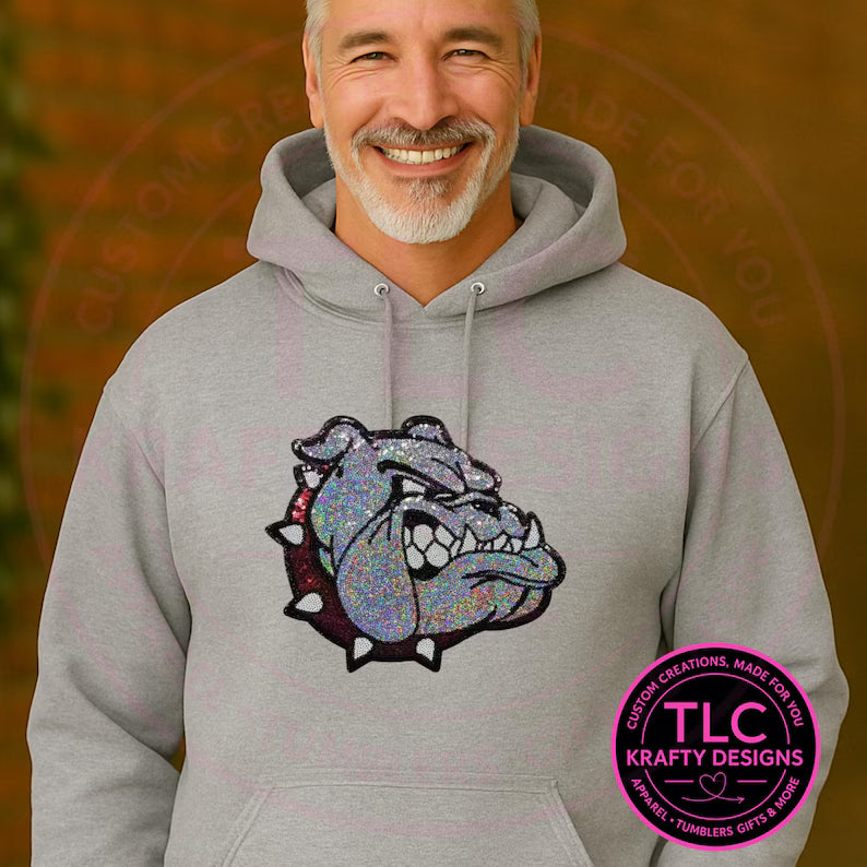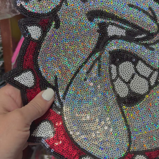 The design features a fierce bulldog face covered in shimmering sequins with a bold red studded collar, making it an eye-catching choice for game days, school events, or custom fan apparel.