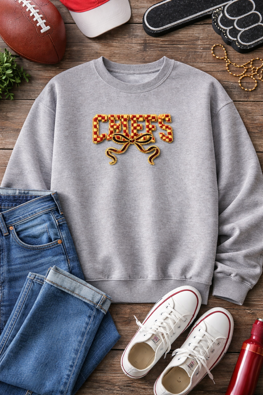 Make a bold statement with this extra-large chenille patch, featuring classic red and gold varsity-style lettering and a detailed sequin bow accent. Designed to stand out, this patch is perfect for game day apparel, jackets, sweatshirts, tote bags, and custom pieces.